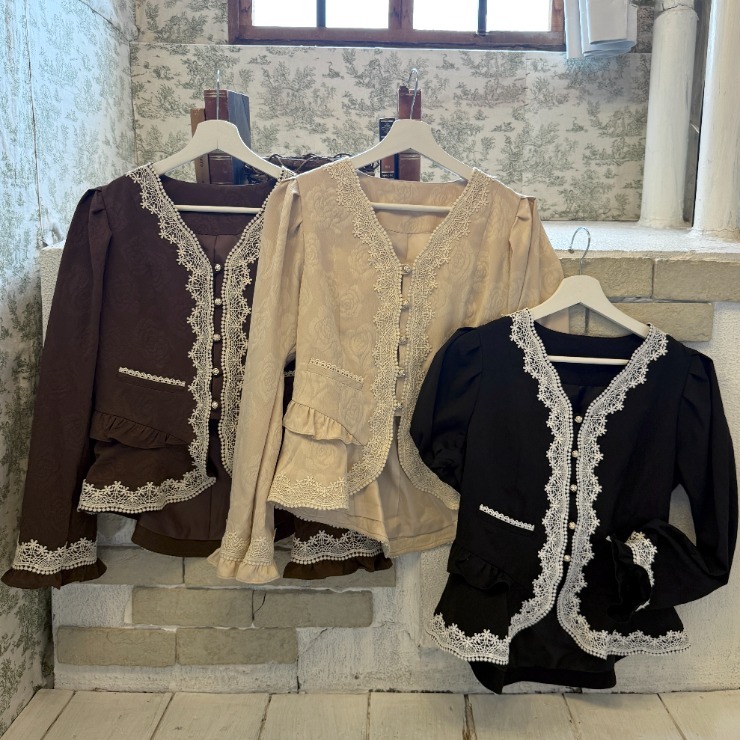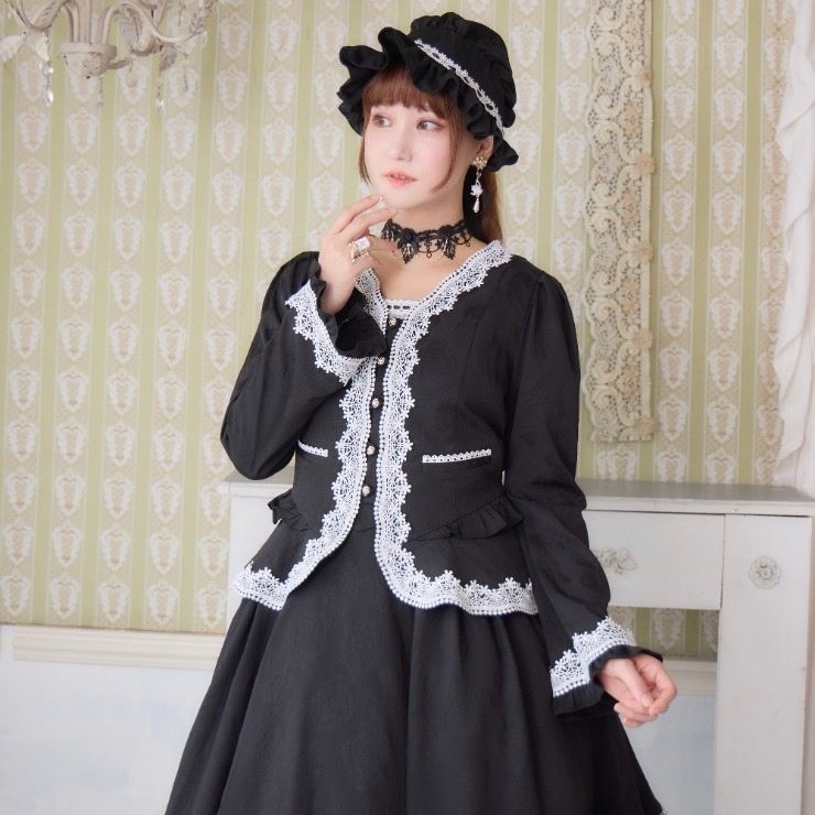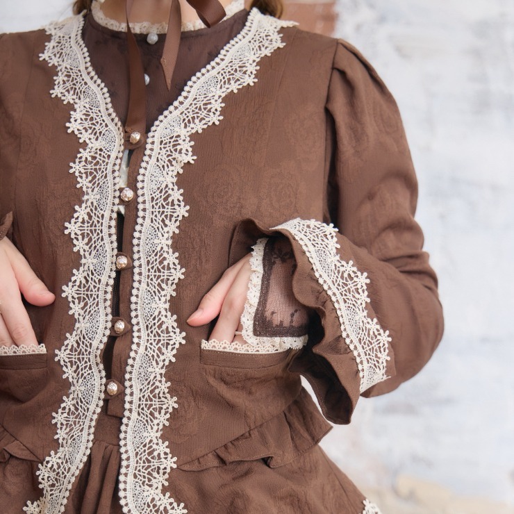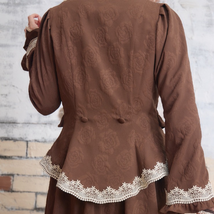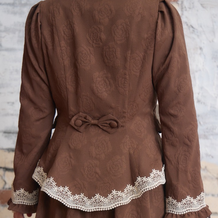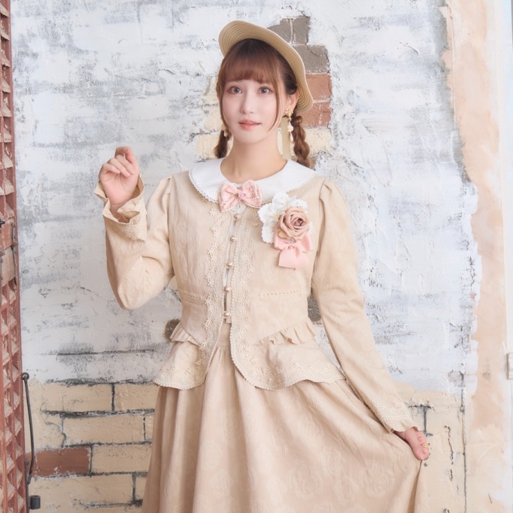 クラシカルな雰囲気のある配色と花柄ジャカード生地がかわいいジャケット。