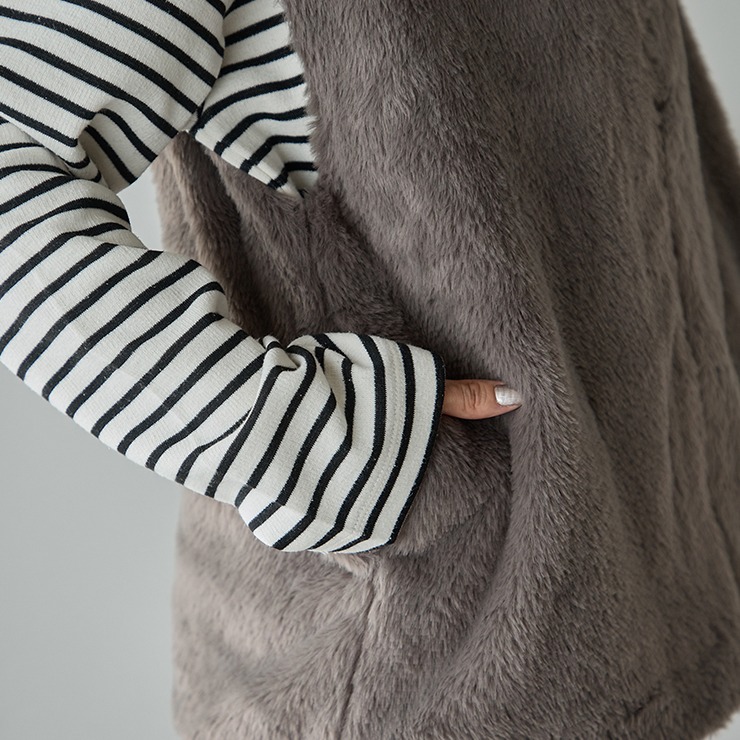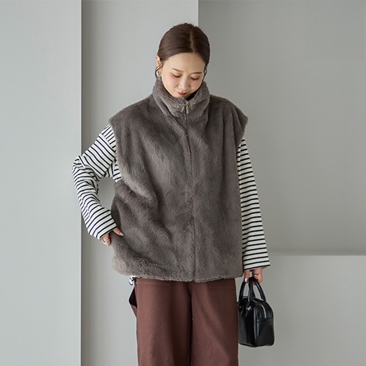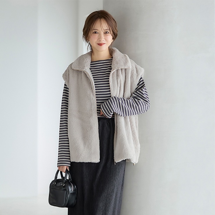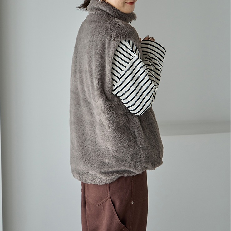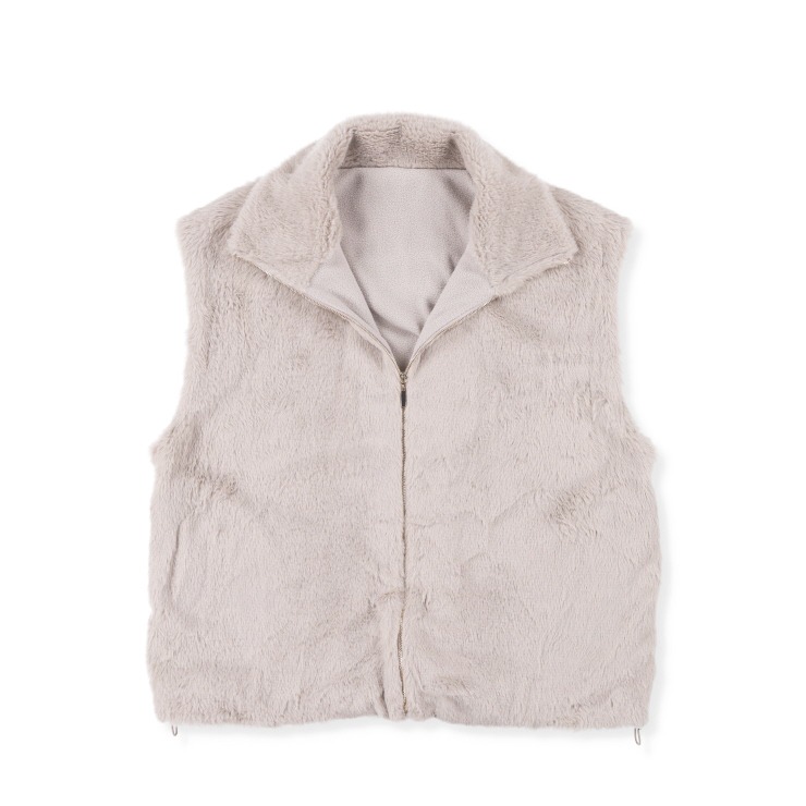 ミンク調のエコファー(ファー:ポリエステル100%)を使用したスリーブレスアウターです。ロンTやニットの上から気軽に羽織れる手軽さが魅力です。裾のドローコードを絞ればバルーンヘムのシルエットが生まれ、今季らしいスタイリングが楽しめます。軽やかな着心地で幅広いコーディネートにマッチして、秋冬のレイヤードスタイルを格上げしてくれる一着です。