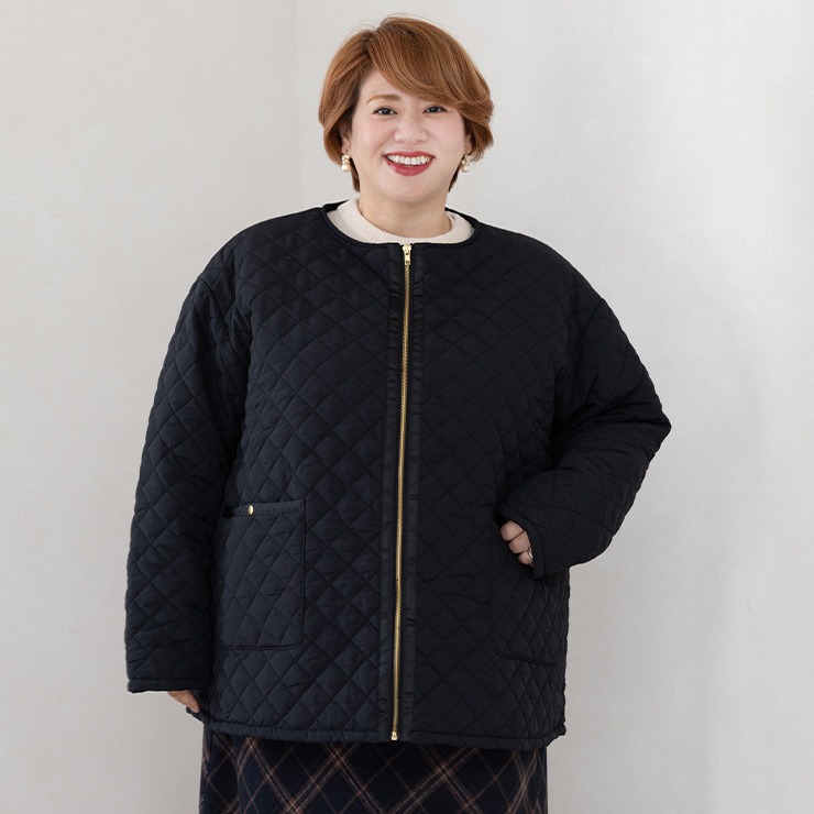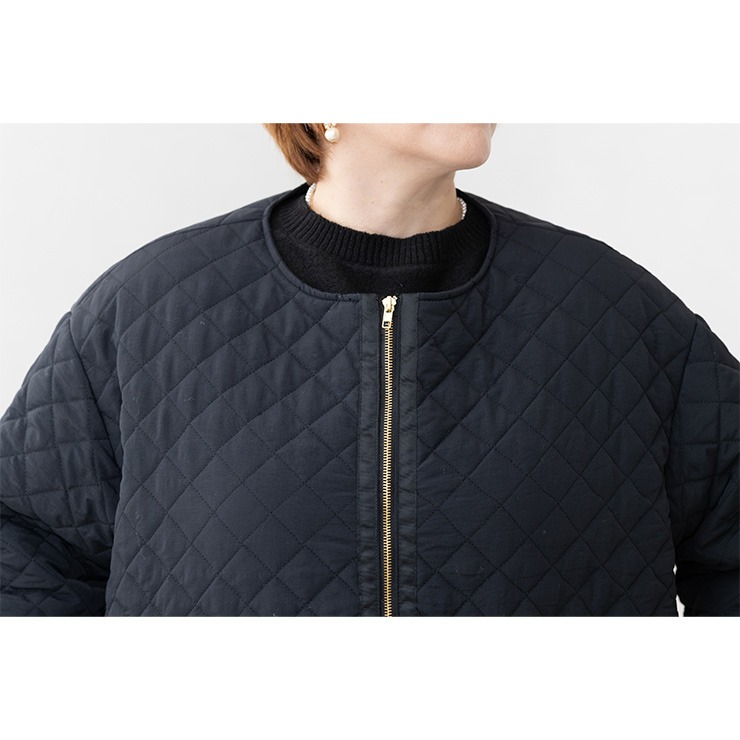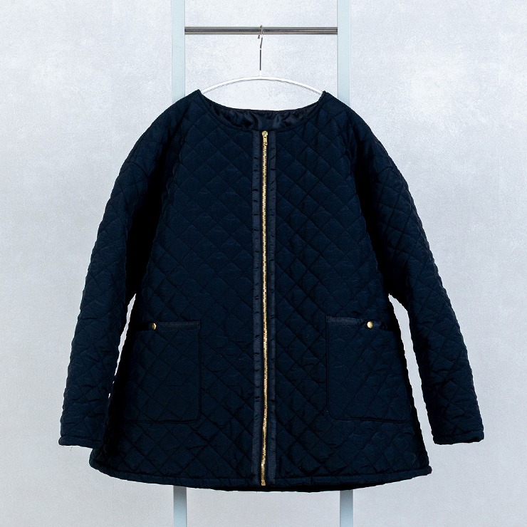 金ボタンとパイピングのテープが上品な印象のキルティングコートです。