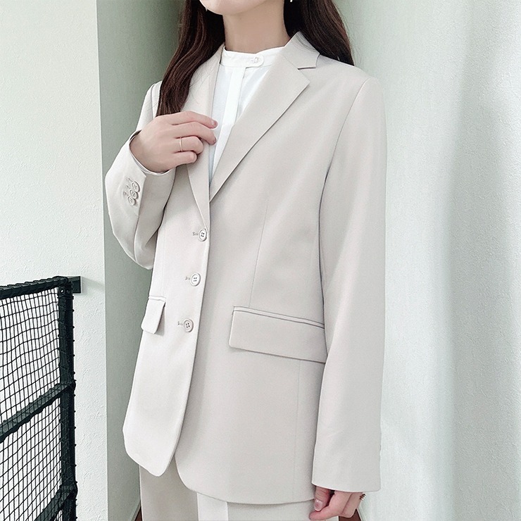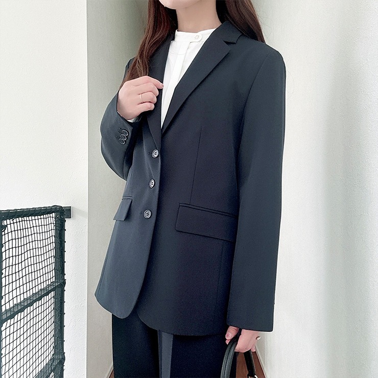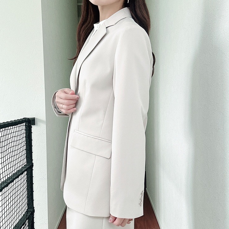 ベーシックなボックスシルエットのテーラージャケットですが、丈を長めに設定しリラックス感のある印象に。