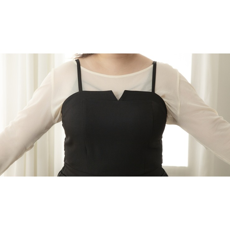 胸元の切り込みディテールがシャープな印象をプラスし、シンプルながらおしゃれ見えする一枚。
