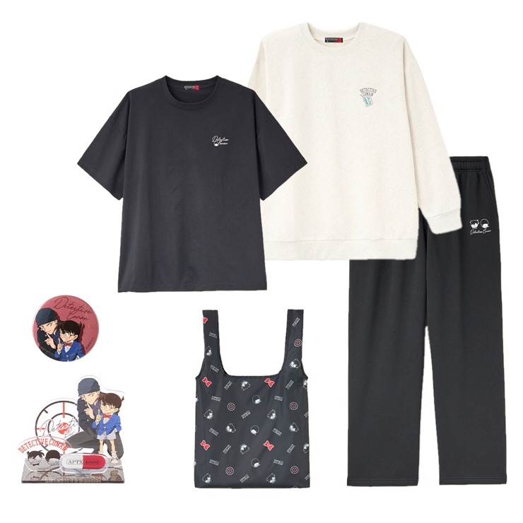江戸川コナン、赤井秀一をイメージした、長袖プルオーバー、パンツ、半袖Tシャツ、アクリルスタンド、缶バッジがエコバックに入っています。