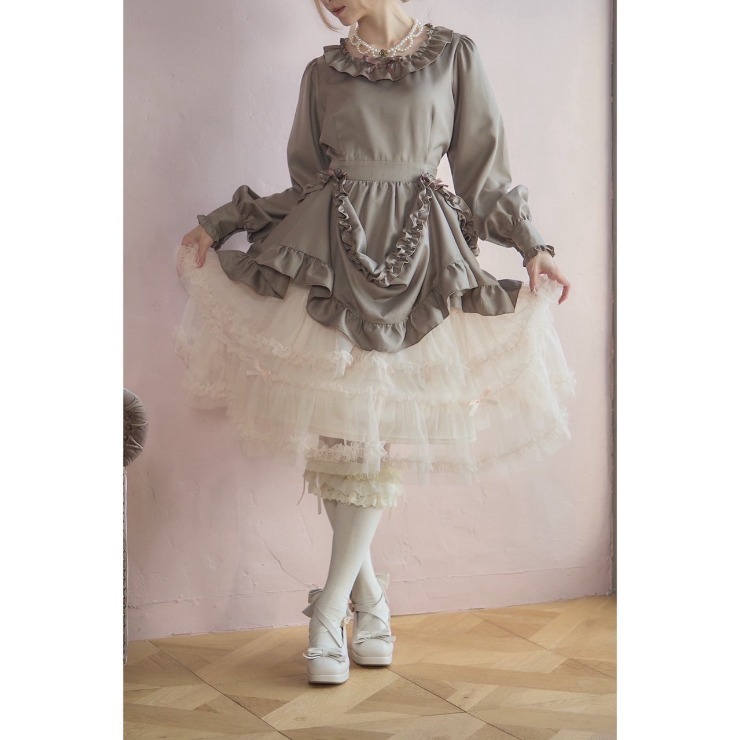 裾のフリル部分はボタンで留めれば、ふんわり立体感のあるバッスル風シルエットに早変わり。