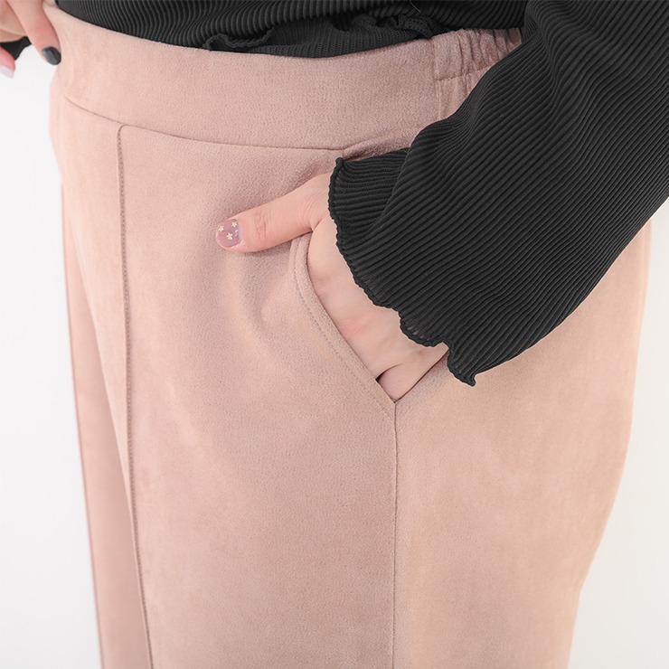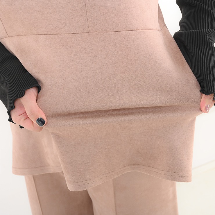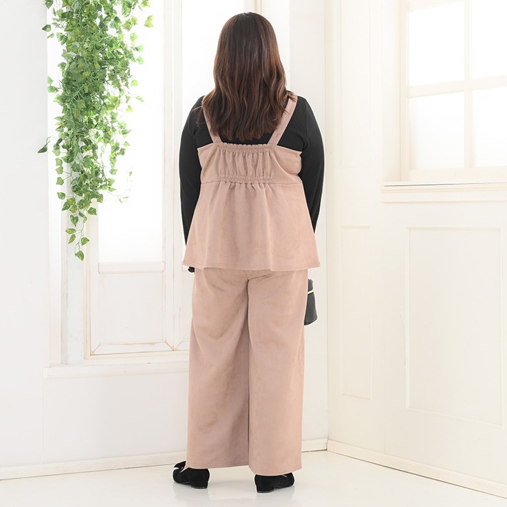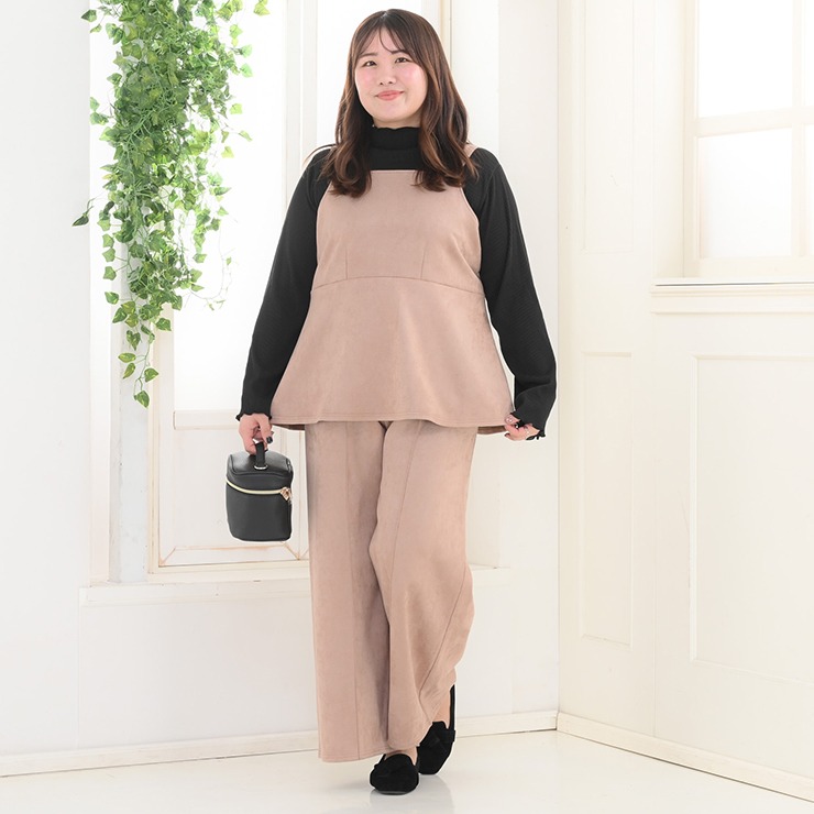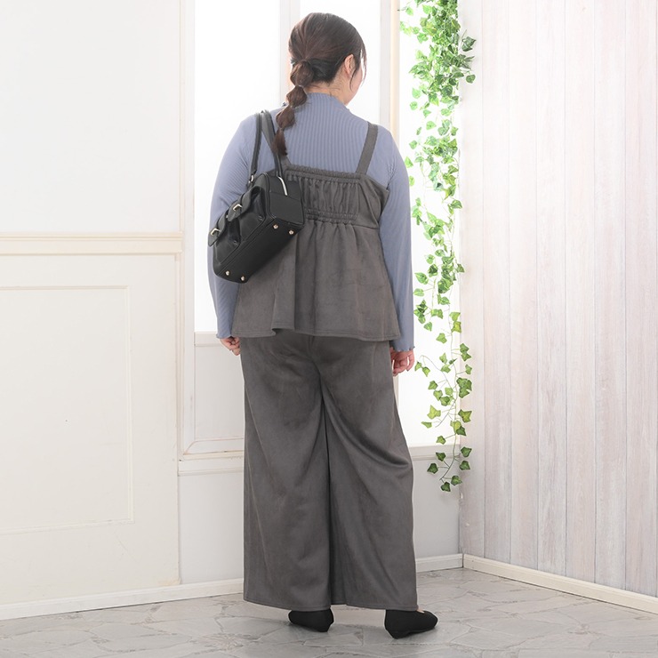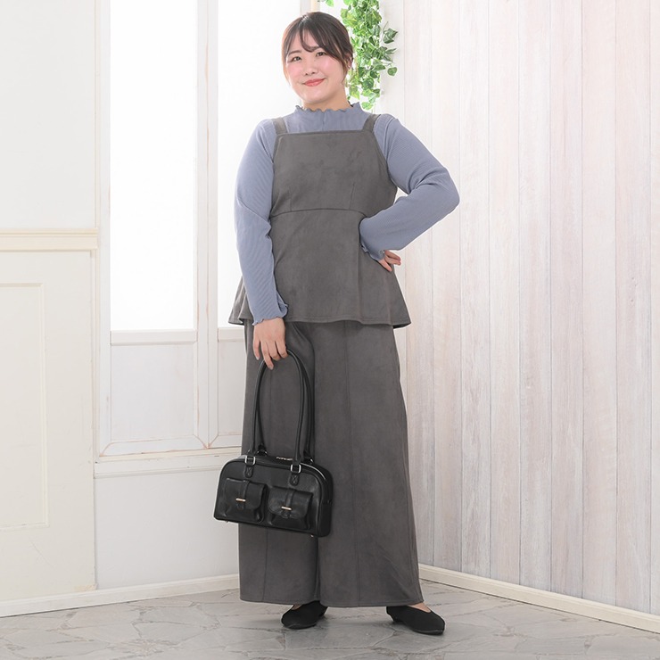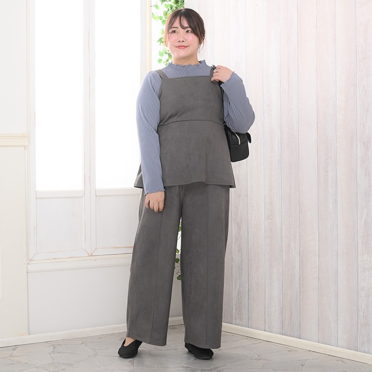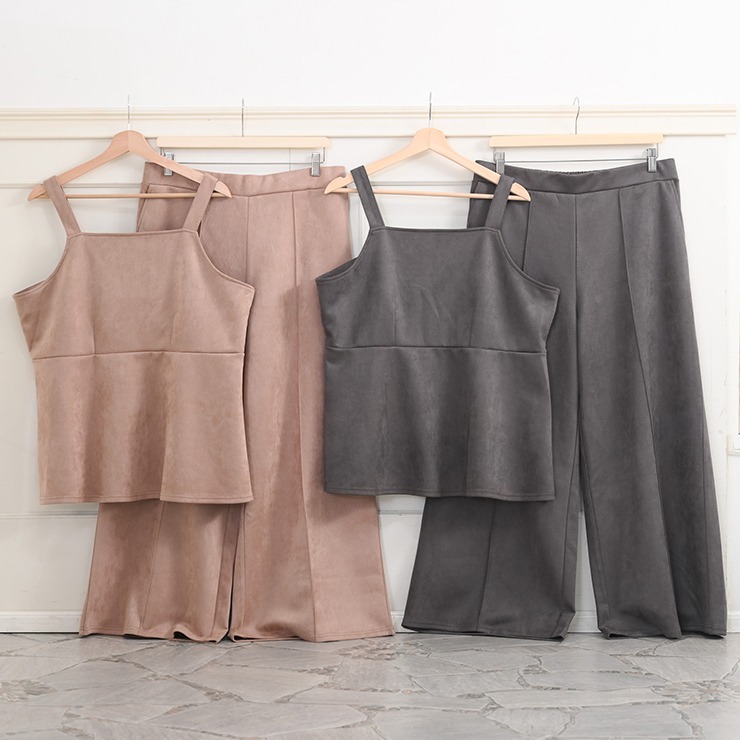 カットソー素材のセットアップです。トップスはウエスト部分から裾にかけて広がるペプラムシルエットになっており、ウエストのくびれを強調しつつお腹周りをさりげなくカバーするデザインです。ボトムスは非常にゆったりとしたシルエットのワイドパンツです。