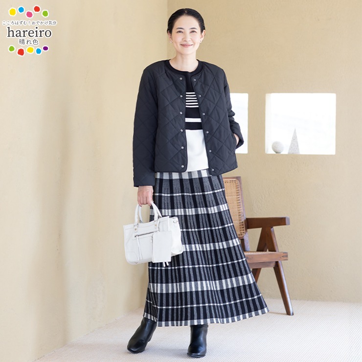 ジャカード編みでしっかりした素材感なので体のラインを拾わず、フレアシルエットが上品な印象を与えてくれます。