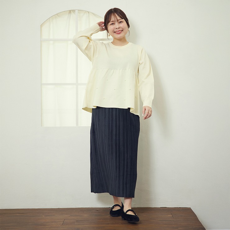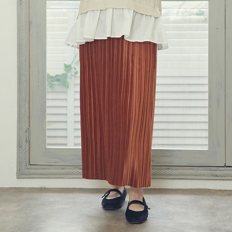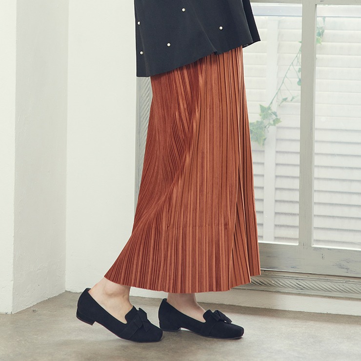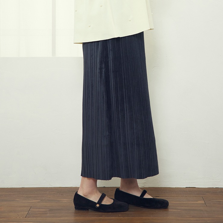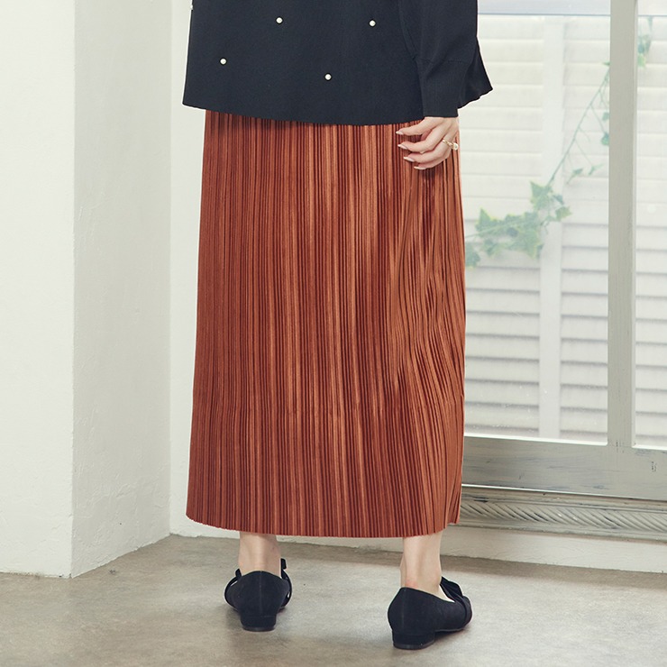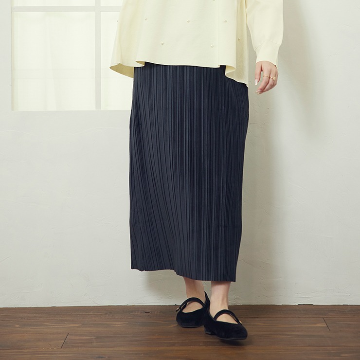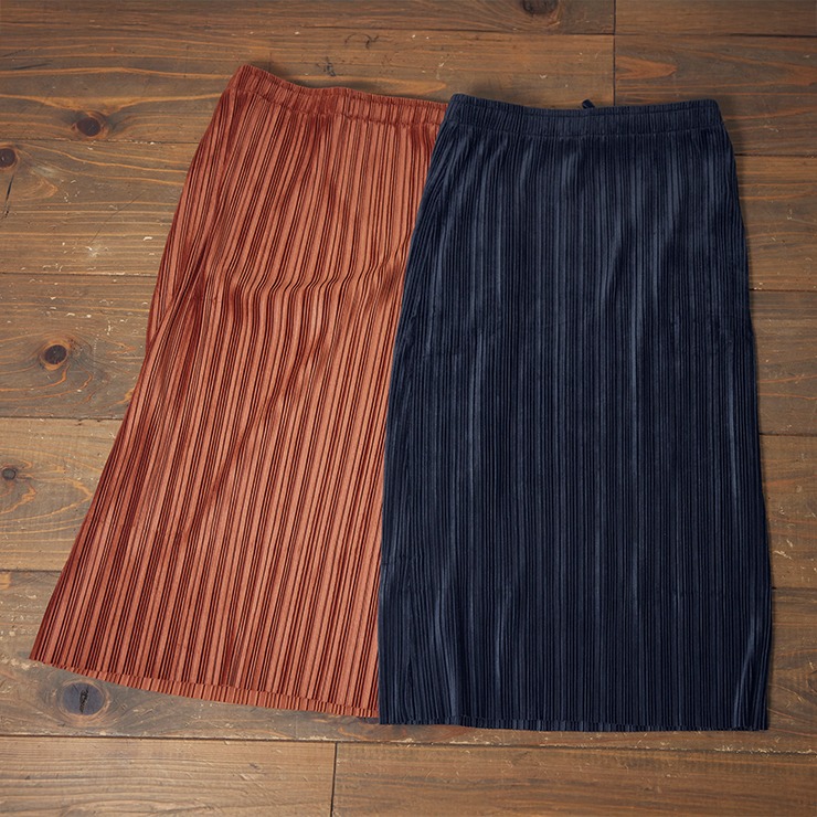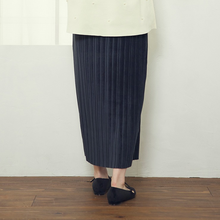 くっきり綺麗なプリーツが「縦」と「直線」を印象付けて脚長効果も!!カットソー素材のベロアなので、伸縮性もあり快適に着用することができます。さらに、ウエストゴム+調節紐付きで楽ちんで機能的なナロースカートです!
