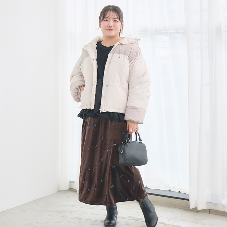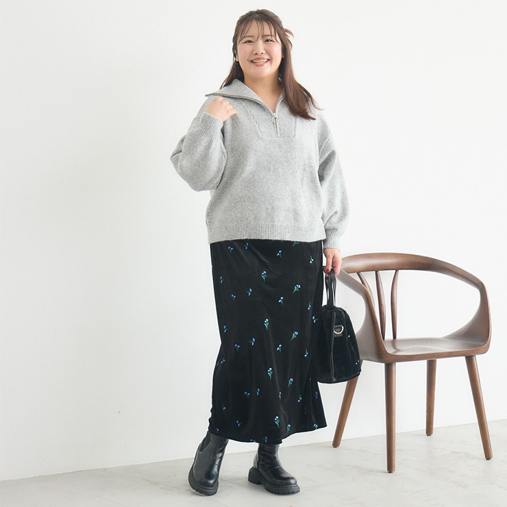 ストレートに近いIラインのシルエットで、落ち着いた色合いながらも花柄で華やかさがあり、リラックス感のある着こなしができるスカートです。