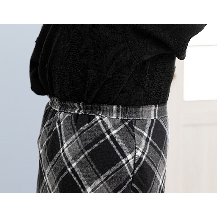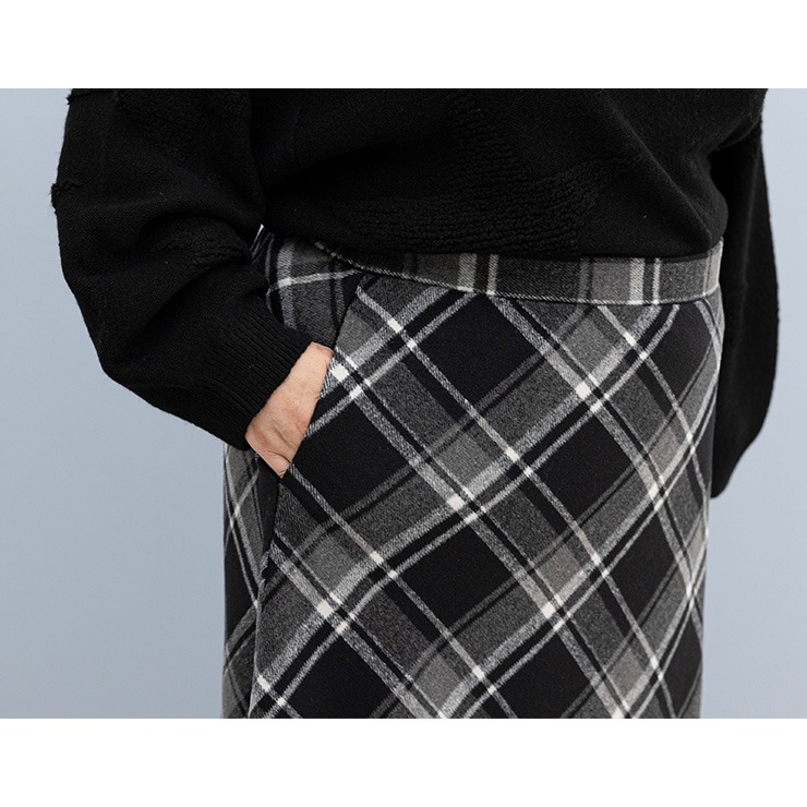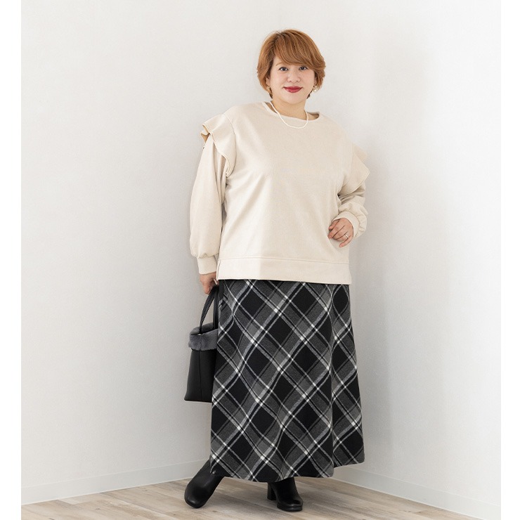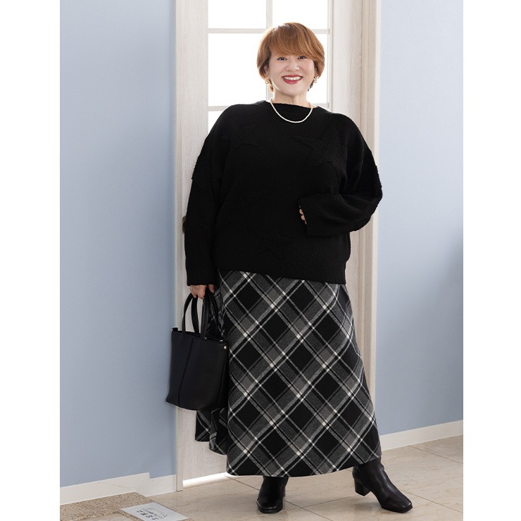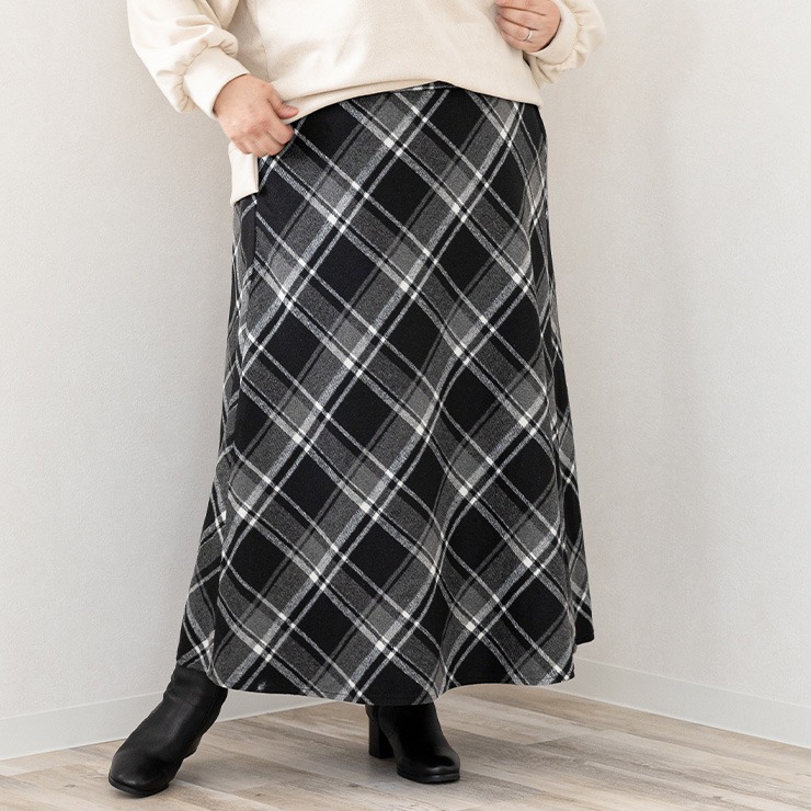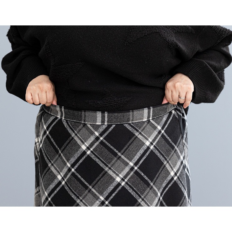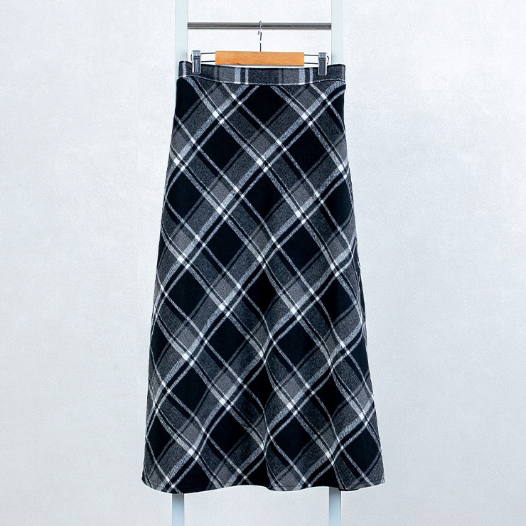 毛足のあるシャギー素材を使用したチェック柄のフレアスカートです。トップスを合わせやすい中黒と、中紺の2色展開です。裏地付き、右ポケット付き。