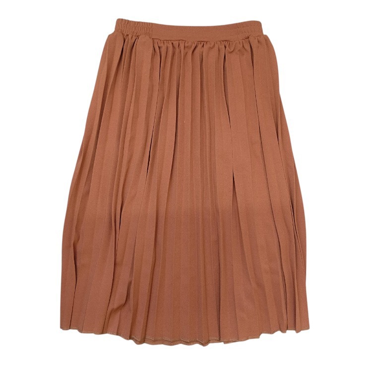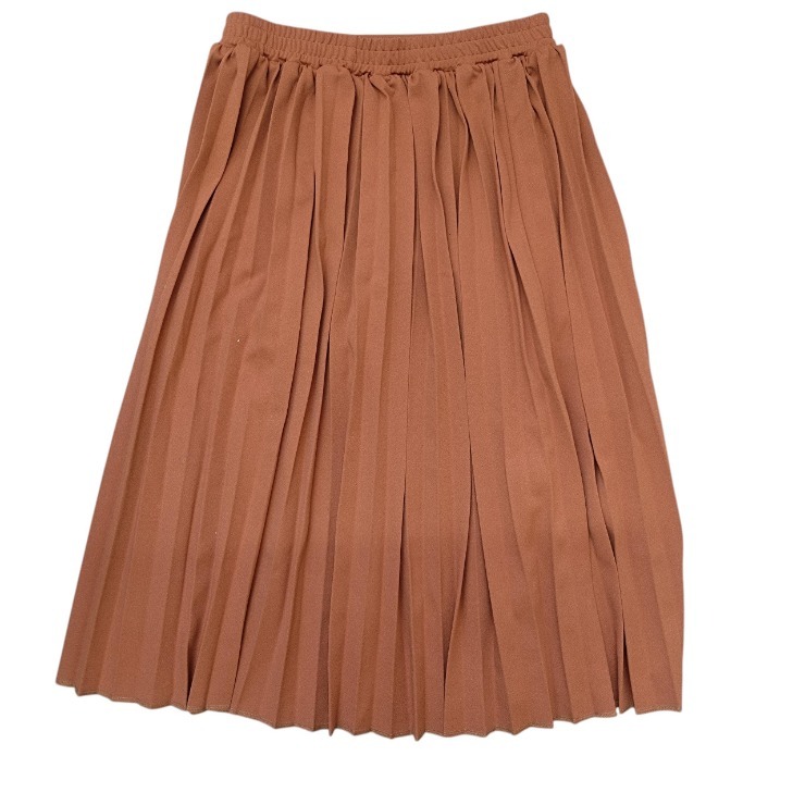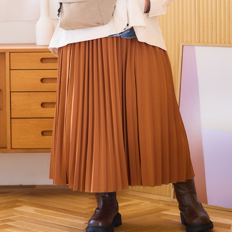 プリーツの陰影が体のボリュームを目立ちにくくしてくれます。また、裾広がりのプリーツなので、腰回りもすっきりとした印象に♪ウエストは幅の広いゴム仕様なので、楽にはけて快適に着用できるプリーツスカートです!!