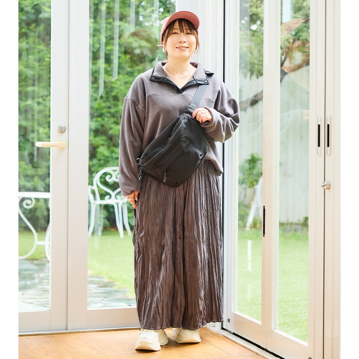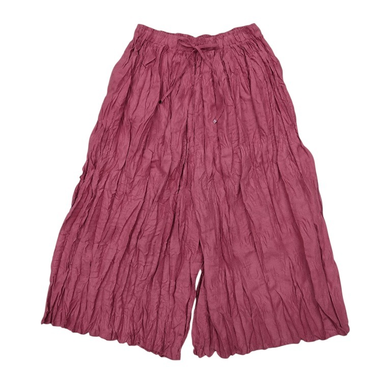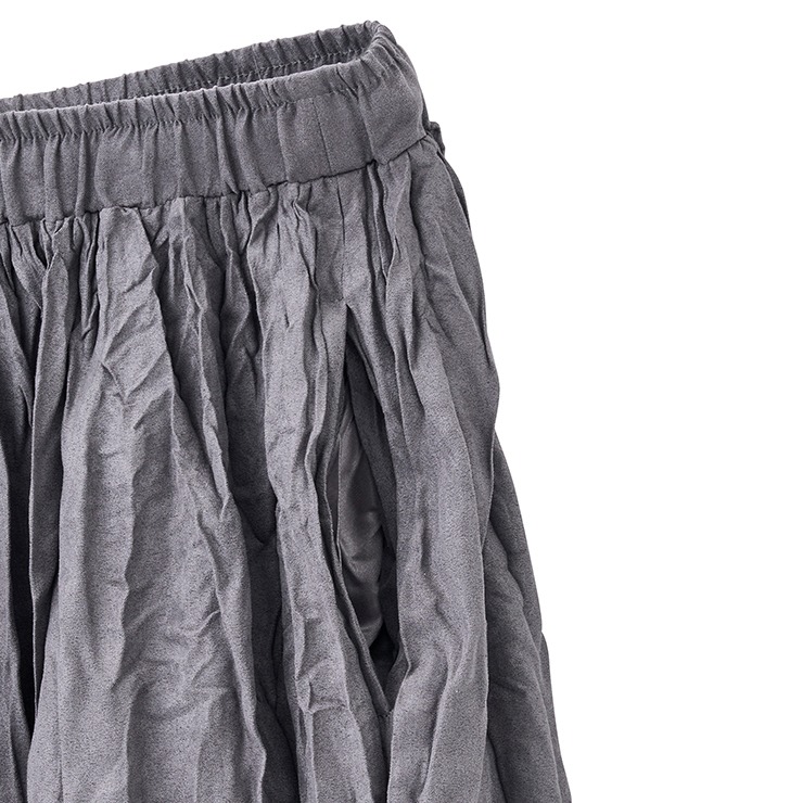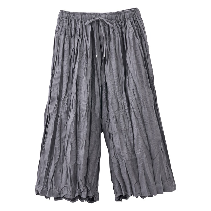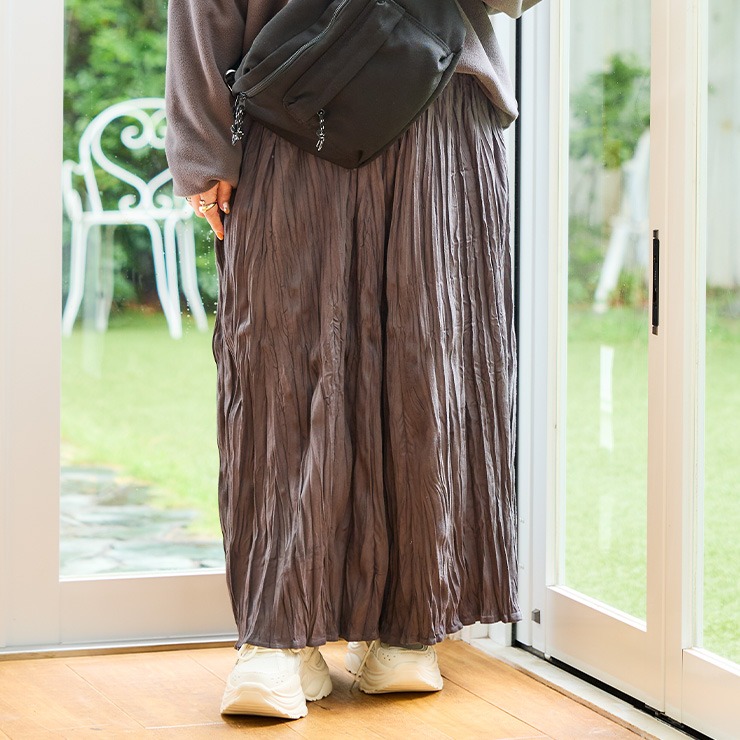 お腹・お尻を目立たせない、しっかり深めの股上!裾幅も広くてスカート見えするスカンツです。縦ラインを強調してスッキリ見せるワッシャープリーツでこなれ感を演出してくれます!さらに、温かみのある素材で季節感コーデにもぴったりなスカンツです!!