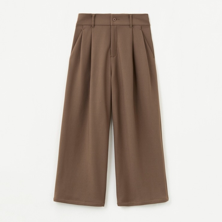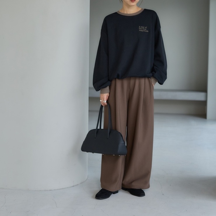 表側はジョーゼット素材、裏側に起毛感のある素材を貼り合わせたカットソー素材のパンツです。やや光沢のある素材なのできれいめにもカジュアルにも着こなせます。前ジップですが後ろに部分ゴムがあり、はき心地がラク。前左右にポケット付きです。