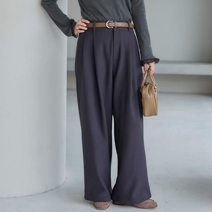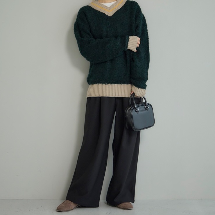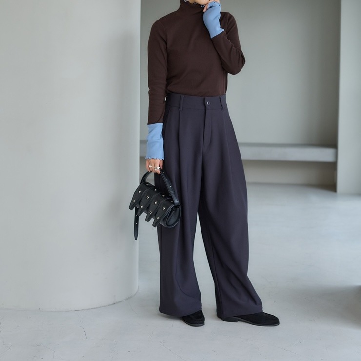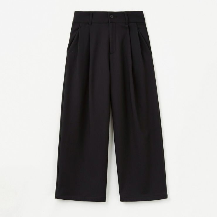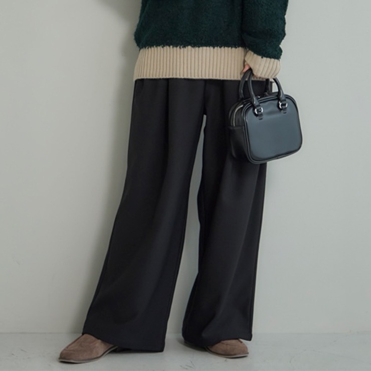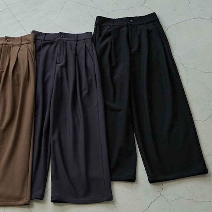 表側はジョーゼット素材、裏側に起毛感のある素材を貼り合わせたカットソー素材のパンツです。やや光沢のある素材なのできれいめにもカジュアルにも着こなせます。前ジップですが後ろに部分ゴムがあり、はき心地がラク。前左右にポケット付きです。