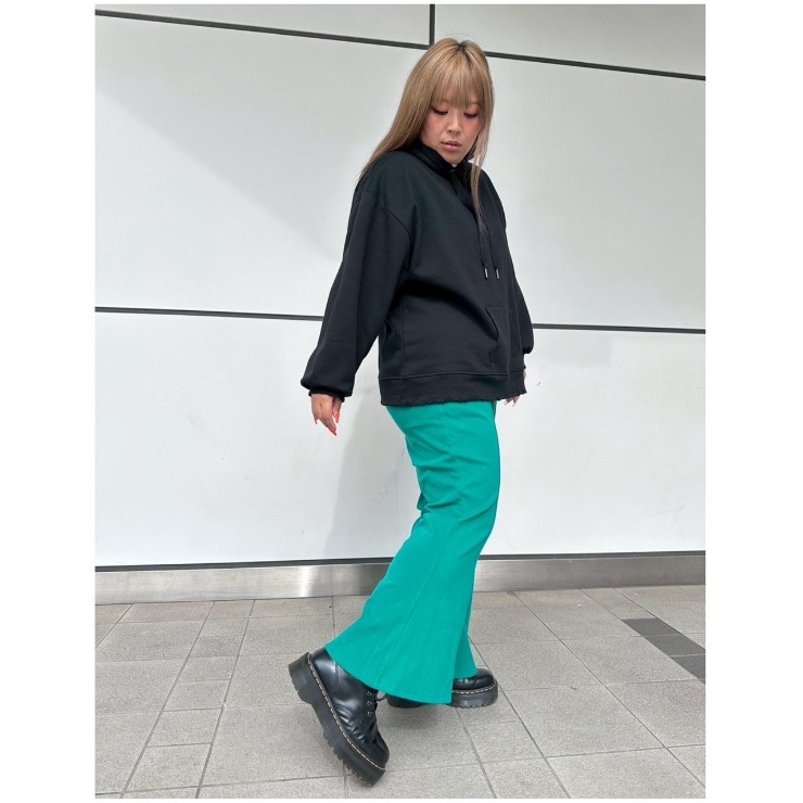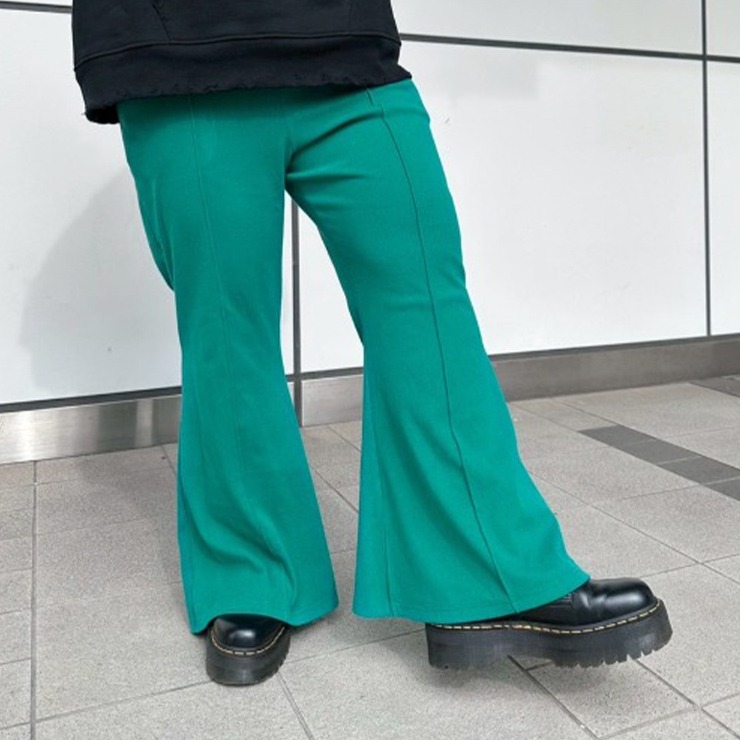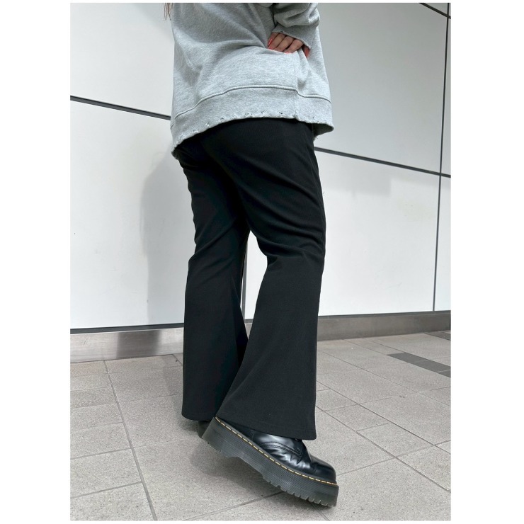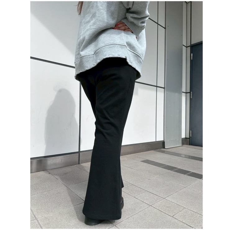 裾の内スリットがさりげなく脚をきれいに見せてくれるフレアパンツ。