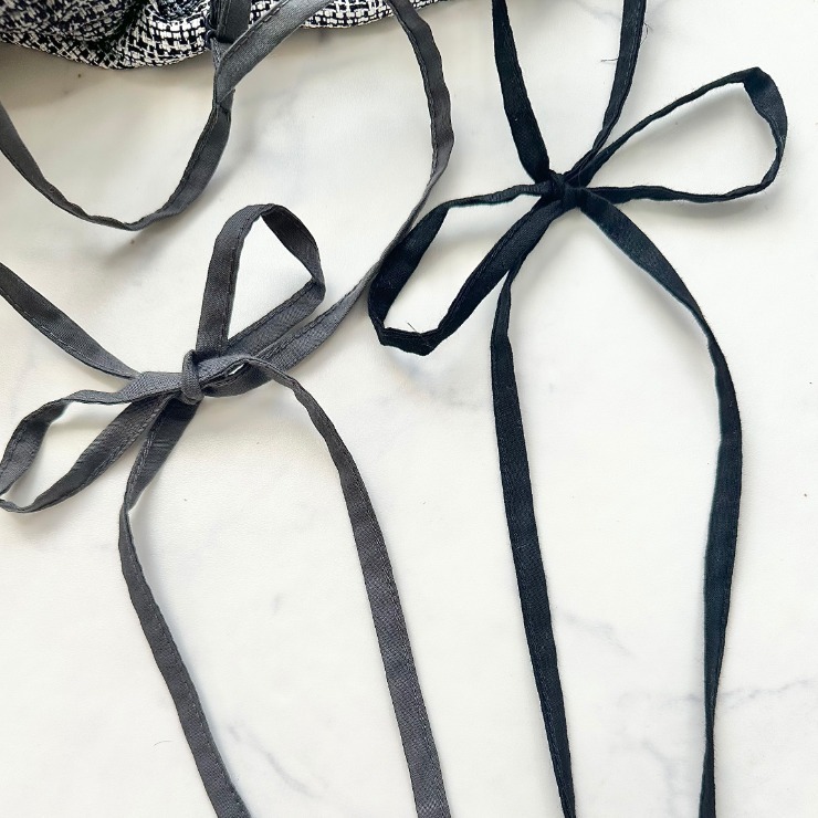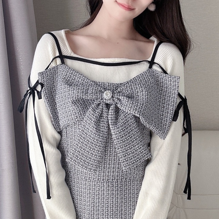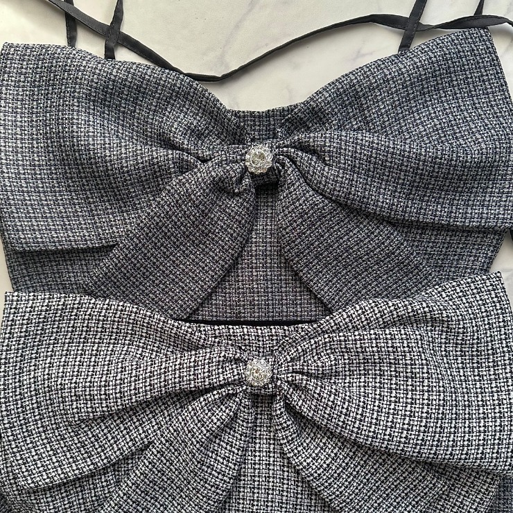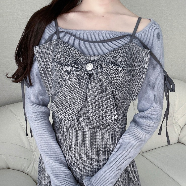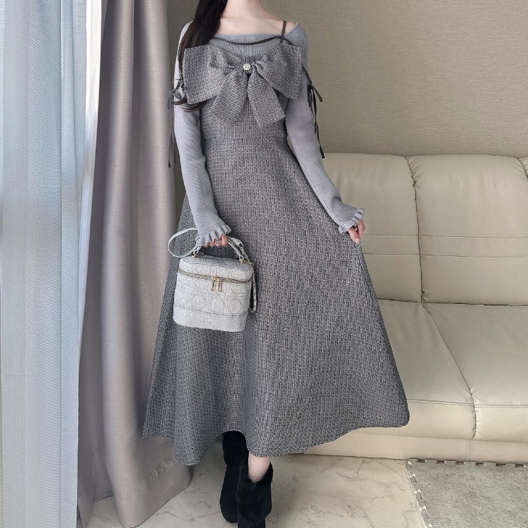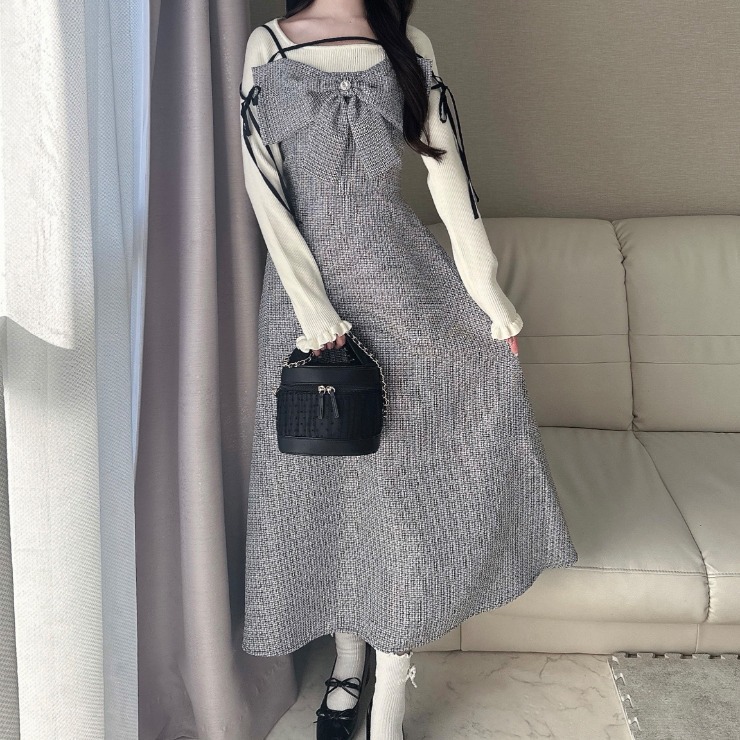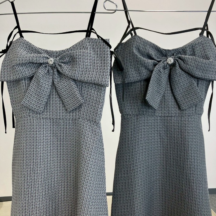 ツイード柄に胸元の大きなリボンがポイントのワンピース。