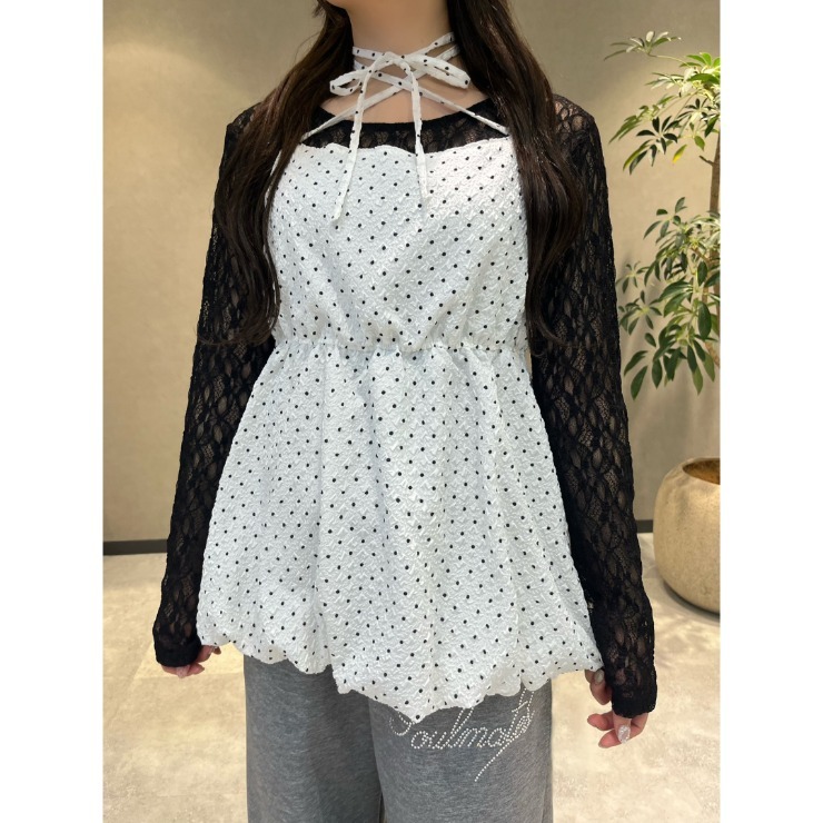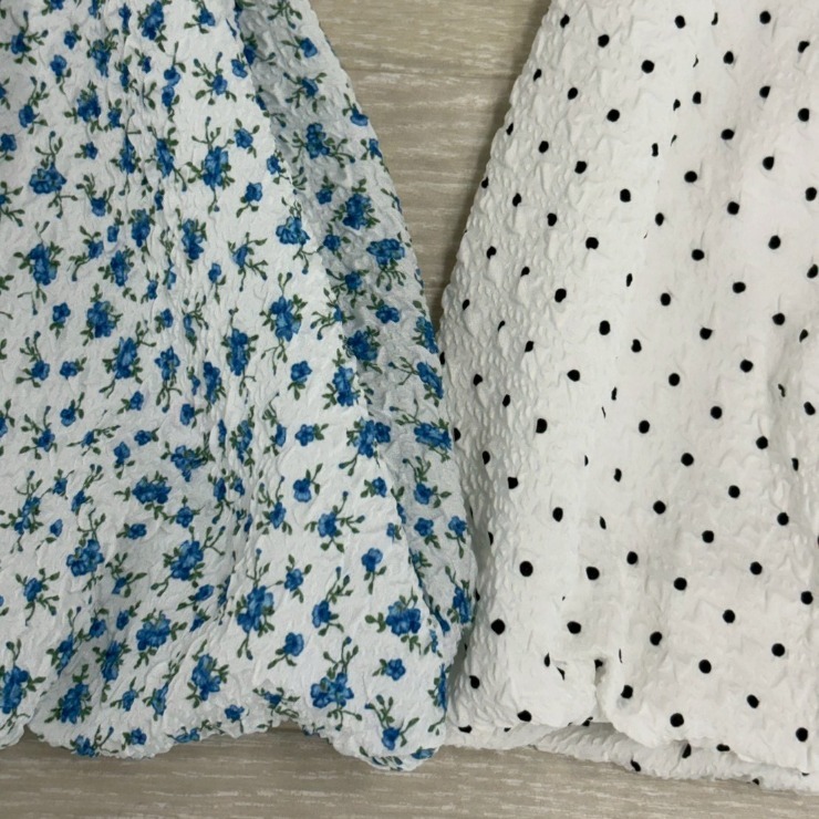凹凸感のある生地にドット柄のプリントを施した裾バルーンなチュニックです。
