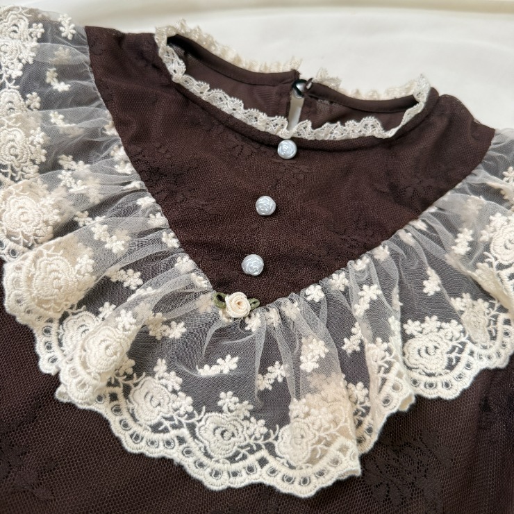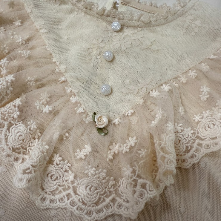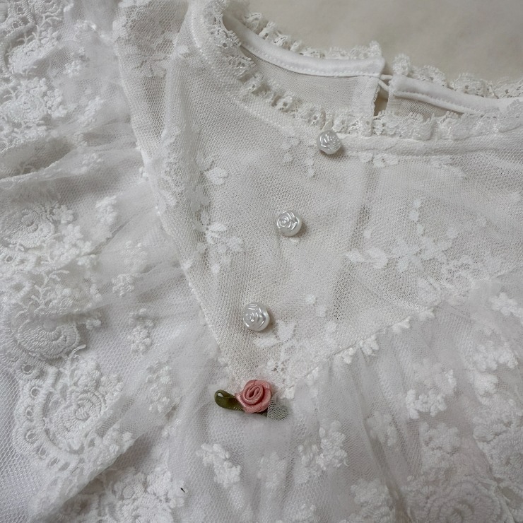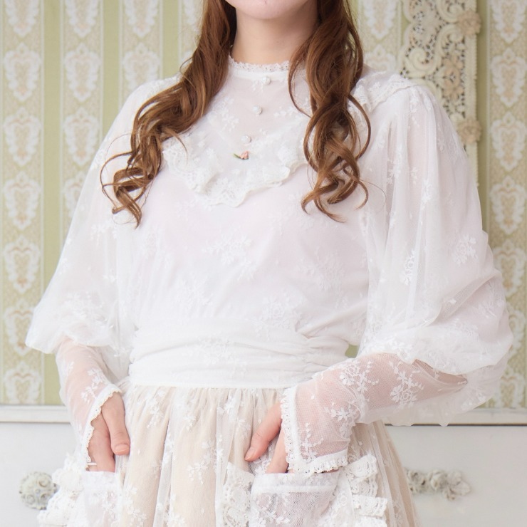 繊細なレースを使い、袖のボリュームやハンドカバーなどを付けてオリジナルに溢れた1枚になっています。