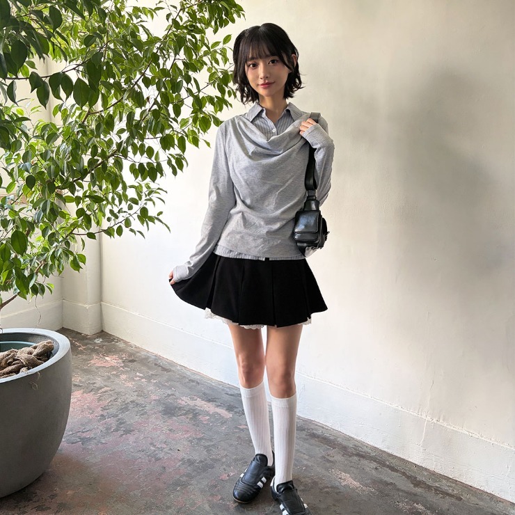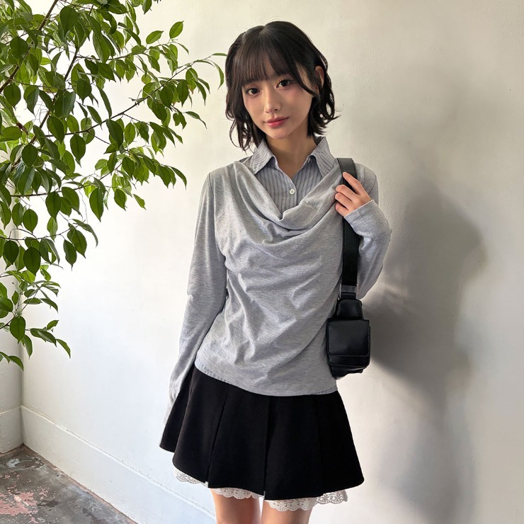 一枚でレイヤードスタイルが完成する、忙しい朝にも頼れるトップスです。