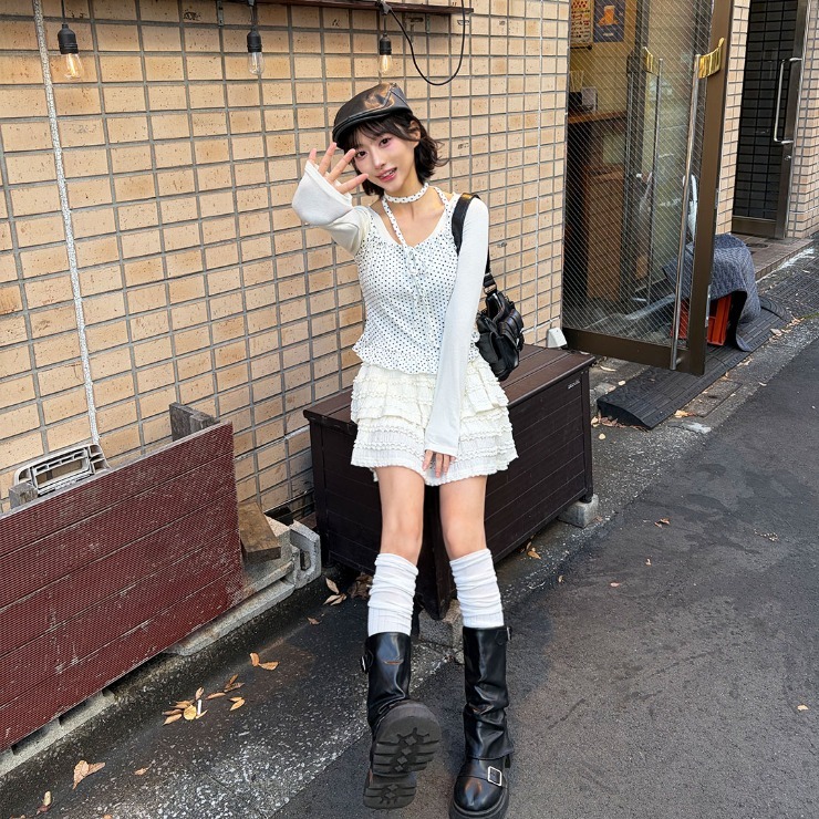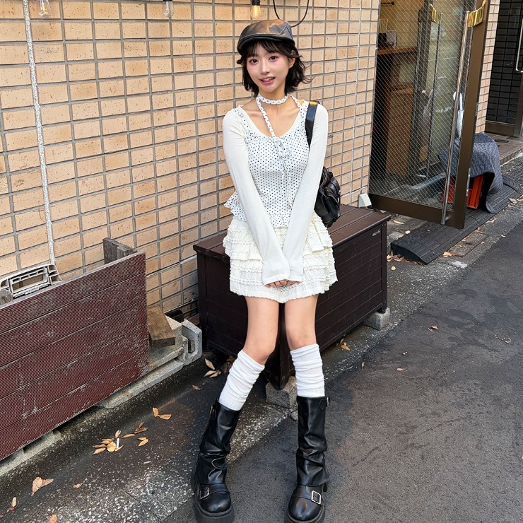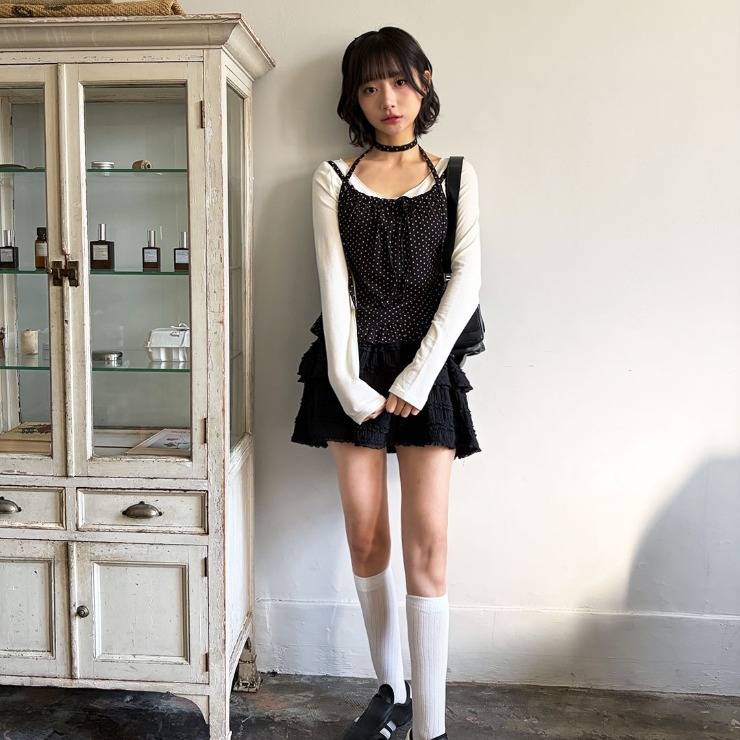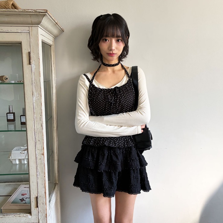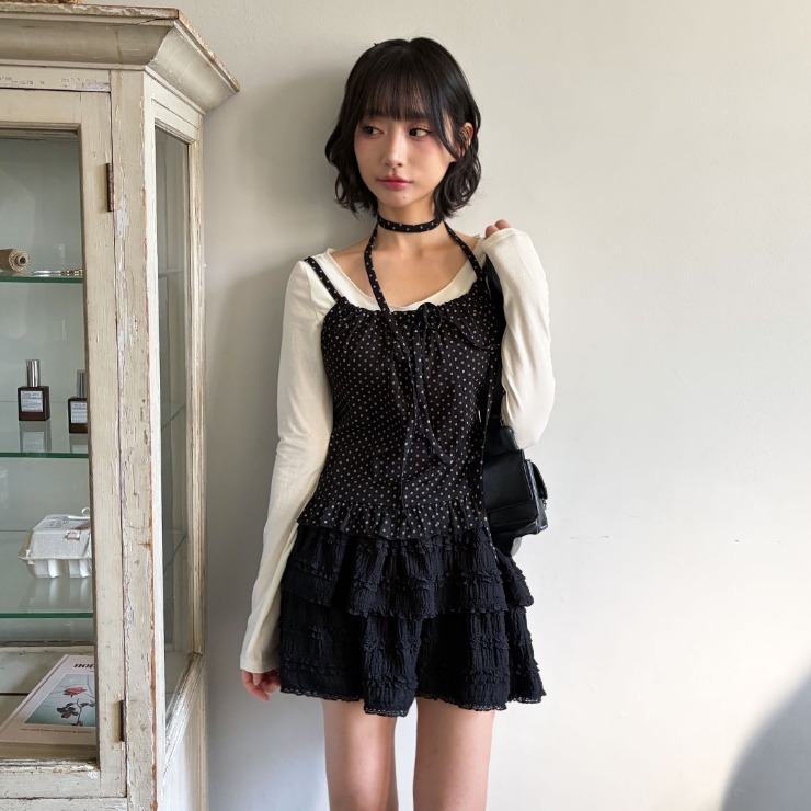 レトロムード漂うドット柄に、トレンド感のあるチョーカーをプラスしたデザイン。