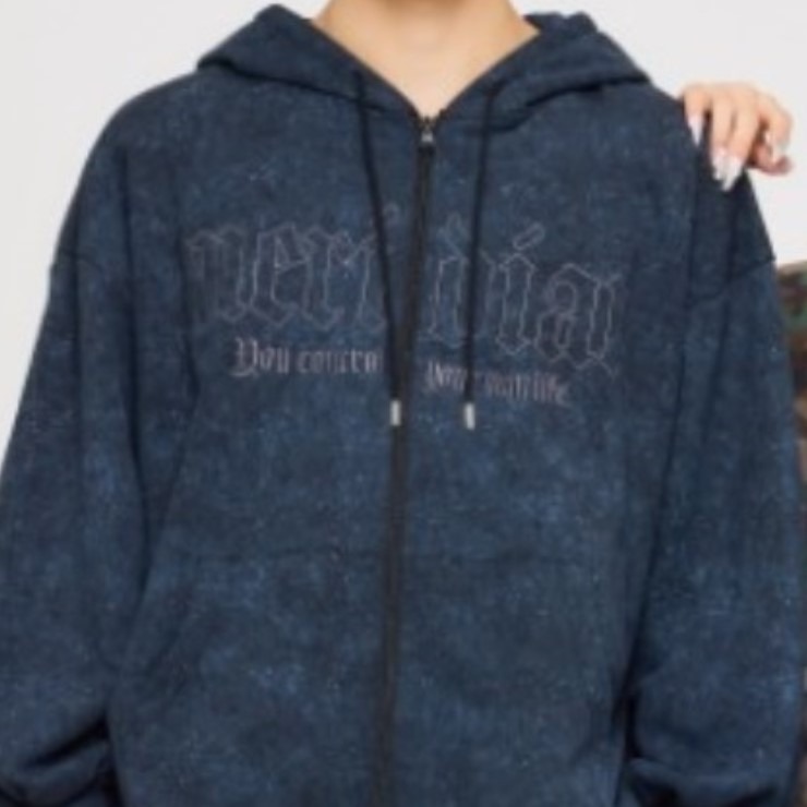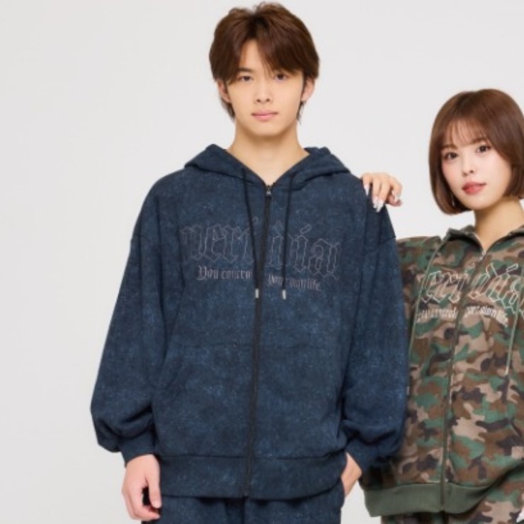 ピグメント風の加工感とラメ加工プリントが施された高見え抜群のジップパーカ。