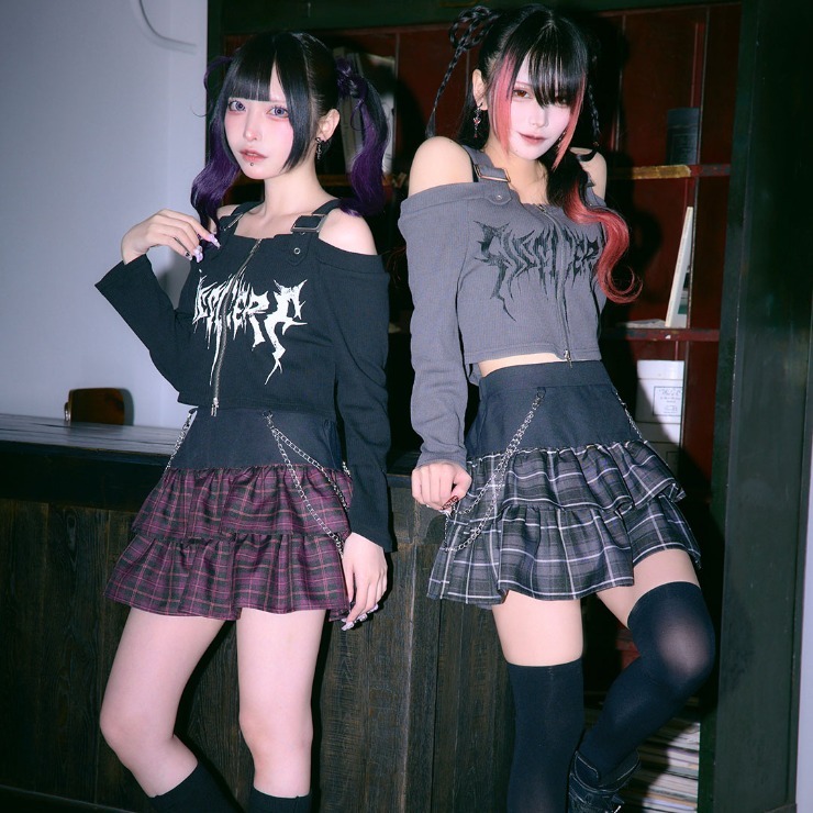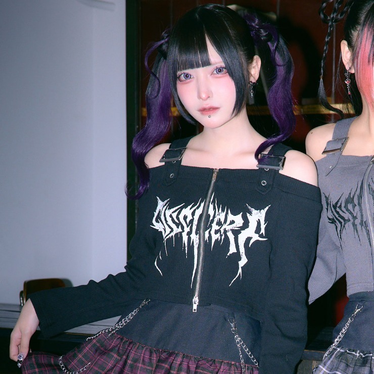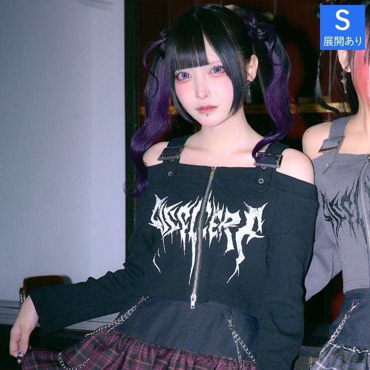 ショルダーのベルトデザインが特徴的なオフショルトップス。