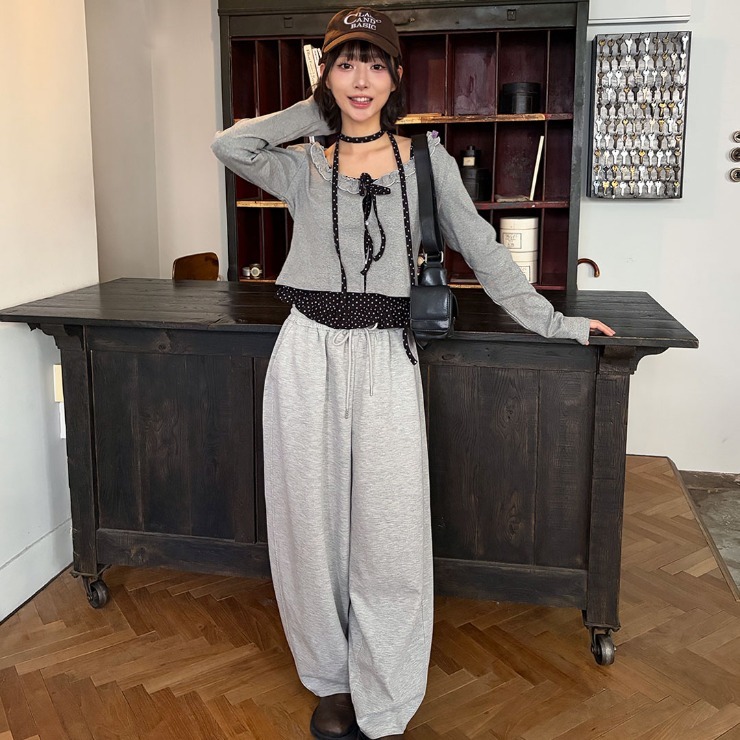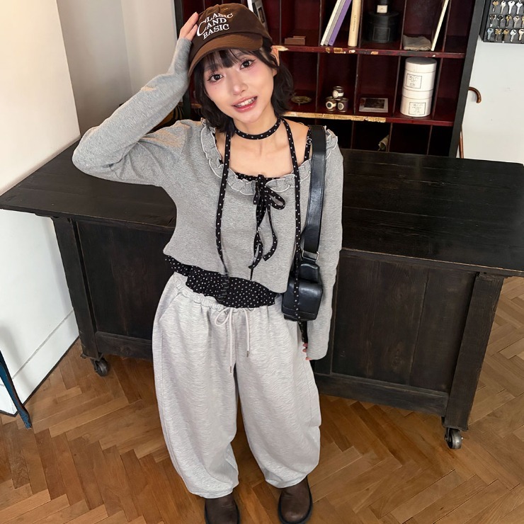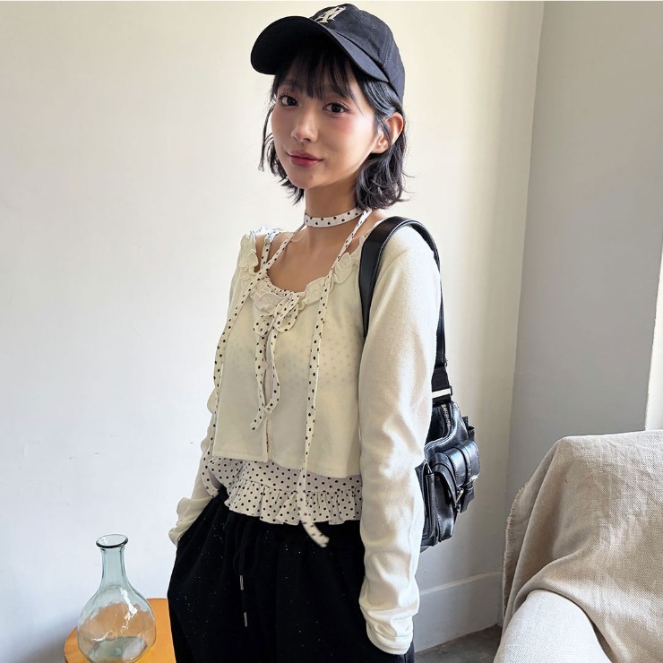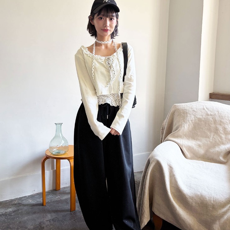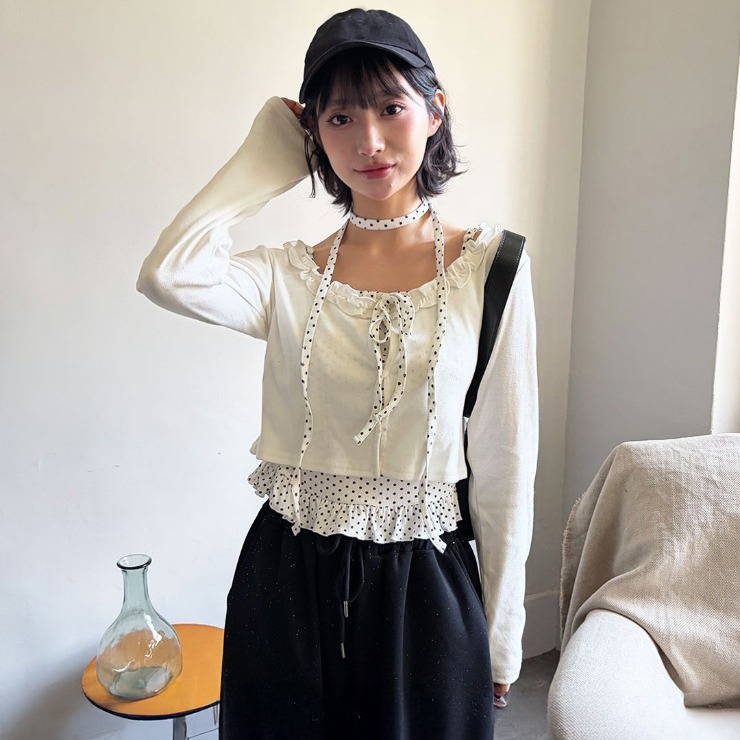 鎖骨まわりをきれいに見せるフリルラインと、胸元のリボンが女性らしさを引き立てるデザイン。
