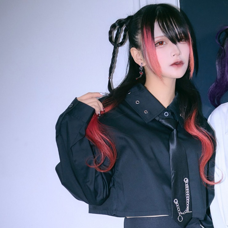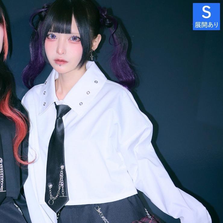 ハトメやチェーンのディテールをあしらったデザインシャツ。