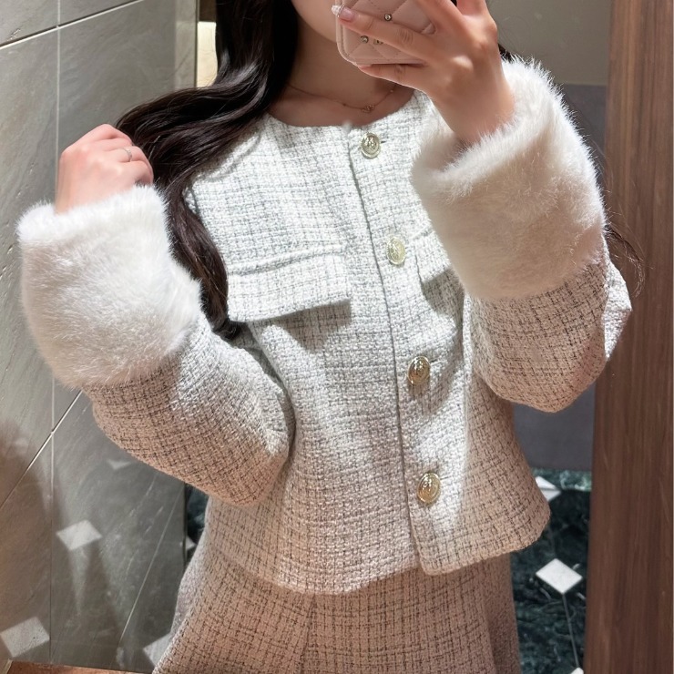 上品なツイード調素材が目を惹くノーカラージャケット。