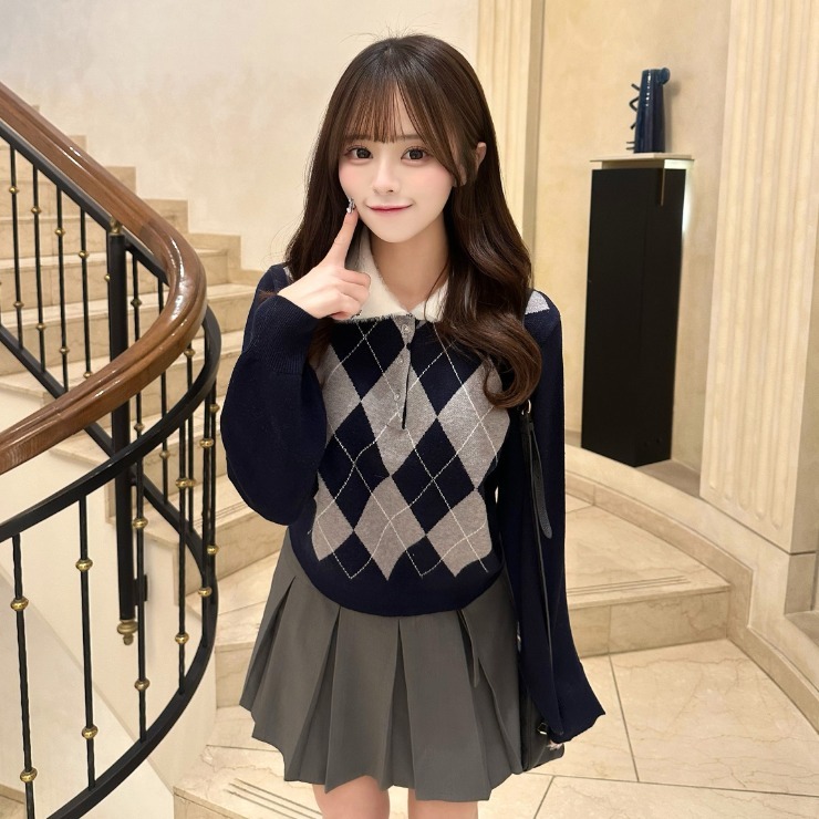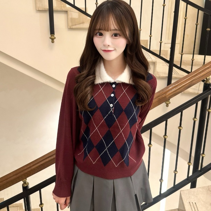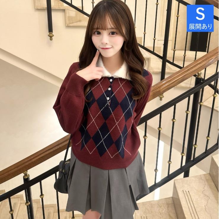 レディース アーガイル柄ポロニットプルオーバー(さやぽん)