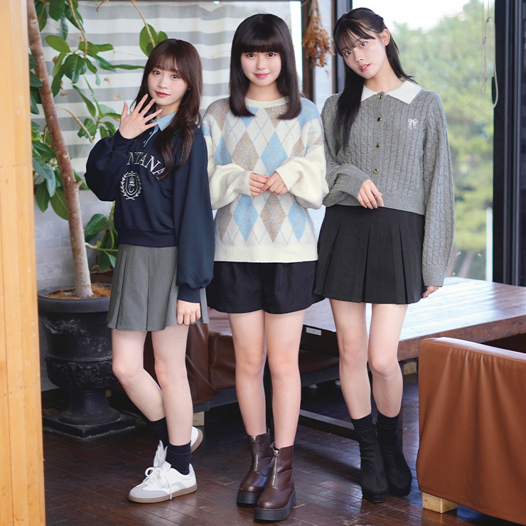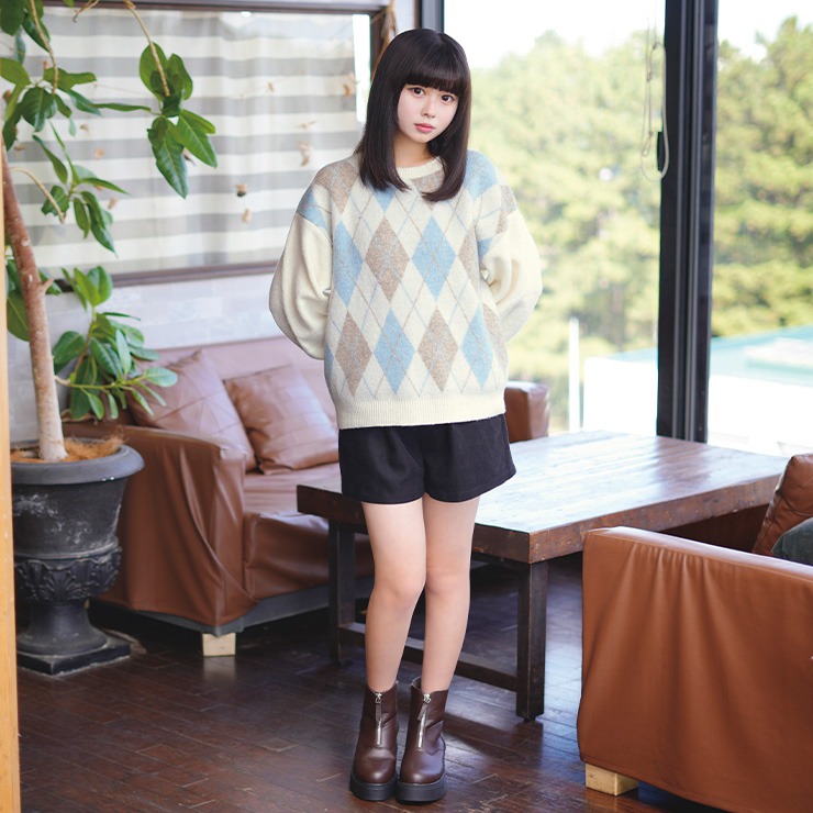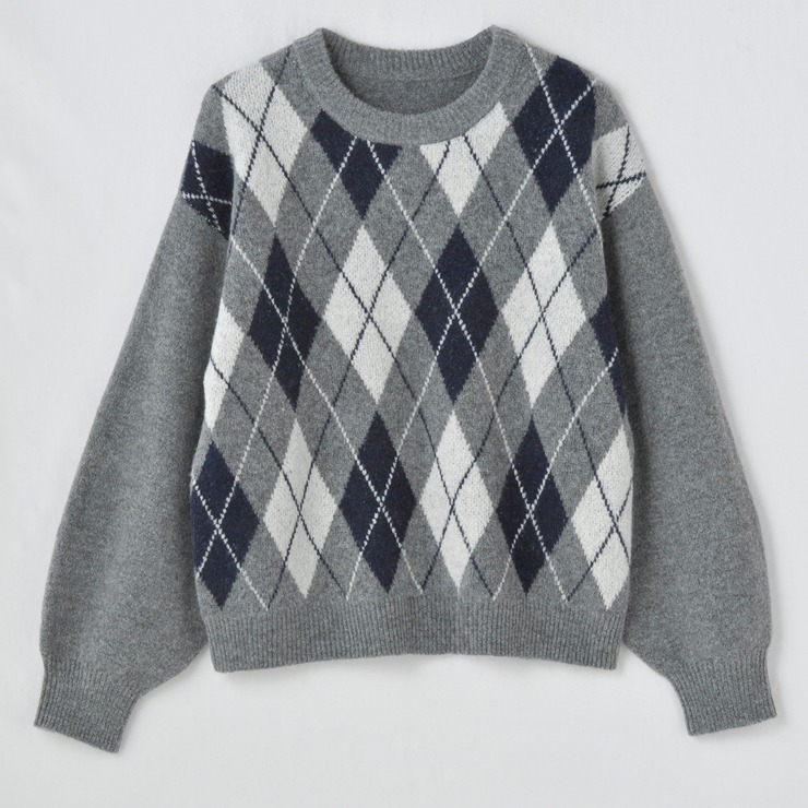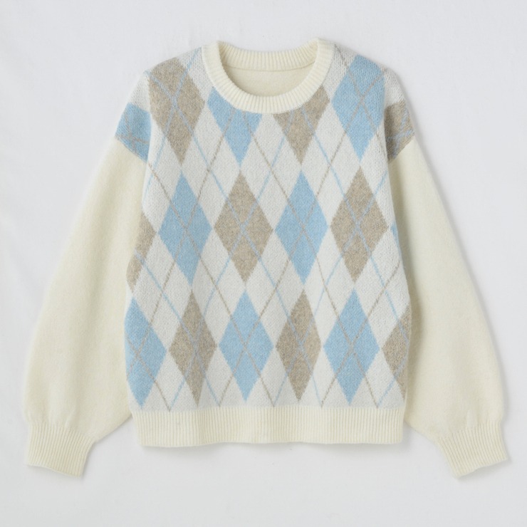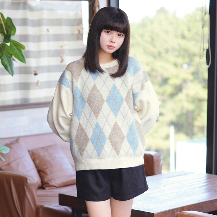 季節感たっぷりのアーガイル柄が目を引く、クルーネックニットプルオーバー。
