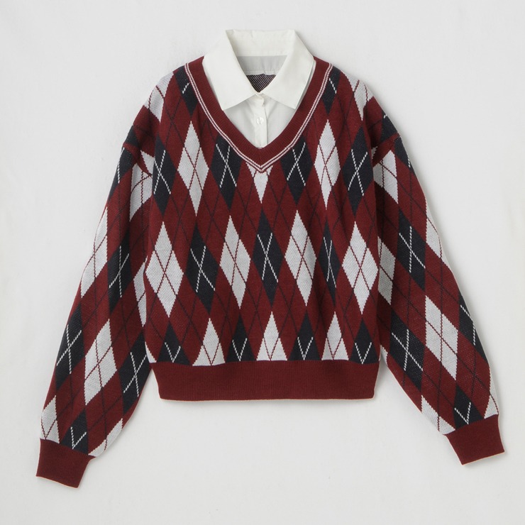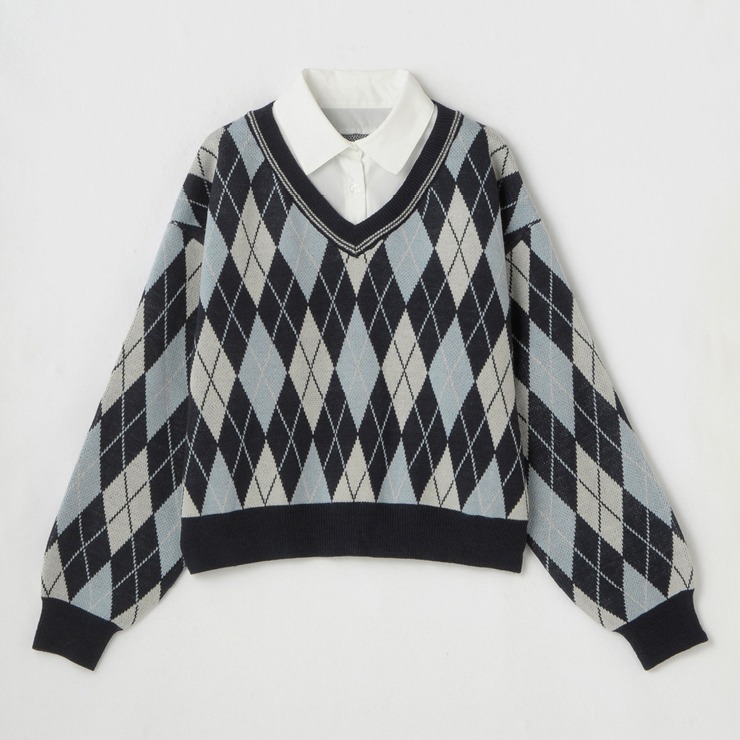 レディース シャツ襟アーガイル柄ニットプルオーバー(瞬間seju)