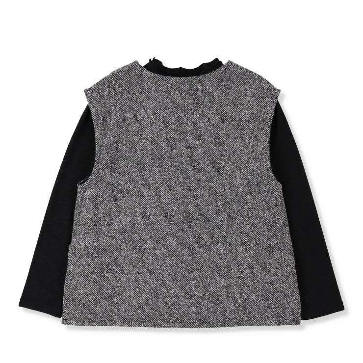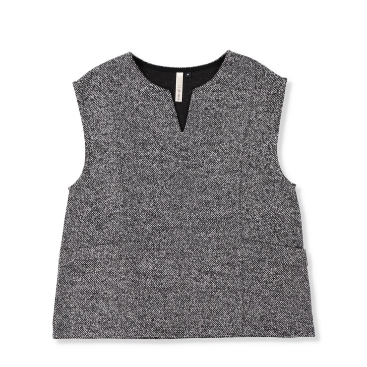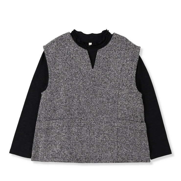 ベストは、肩から流れる斜めのタックとV字のネックラインが、すっきりと洗練された印象を演出します。