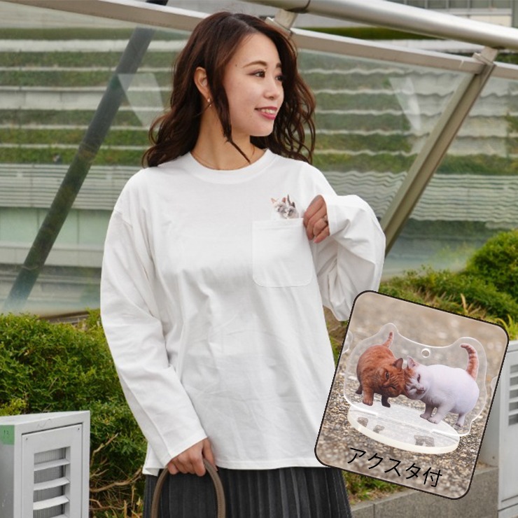 胸元ポケットから猫ちゃんがひょっこり覗いているようなデザイン。サラッとした柔らかい素材が着心地も抜群な1枚です◎