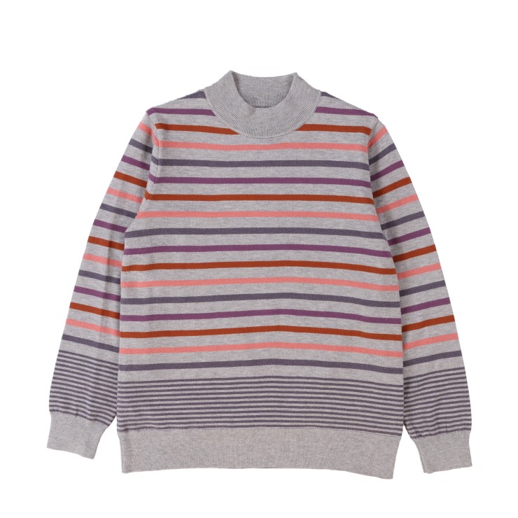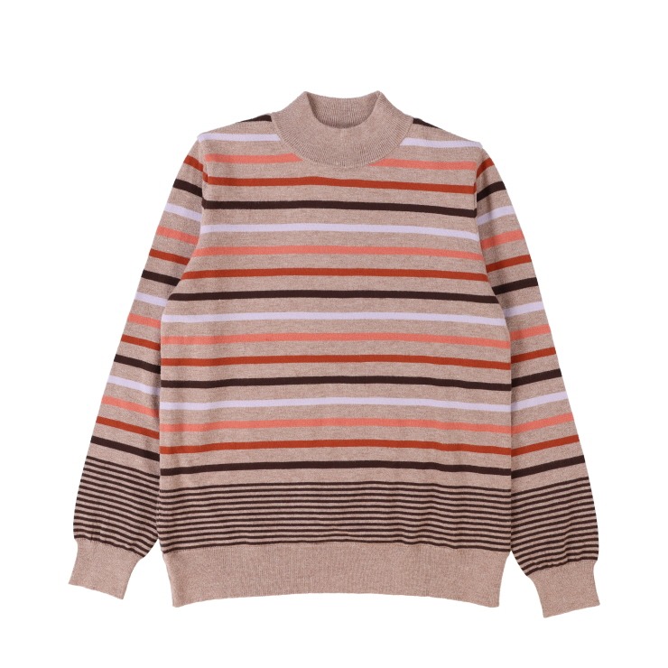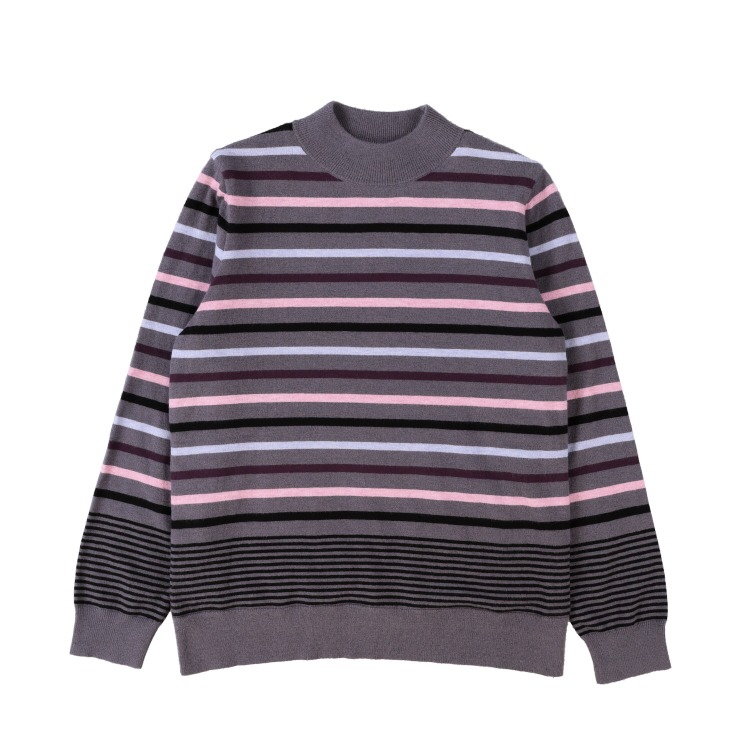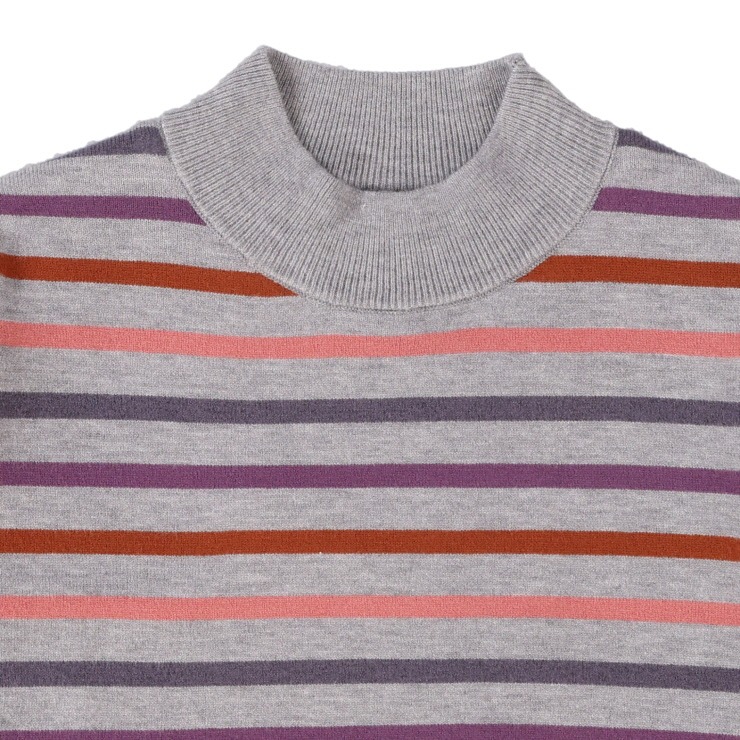 マルチカラーで華やかな印象のニットプルオーバーです。裏地にベロア素材を使用しており、ハイネックの仕様なので、とてもあったかな優秀ニットです。ご家庭の洗濯機洗いも可能でお手入れ楽ちん!