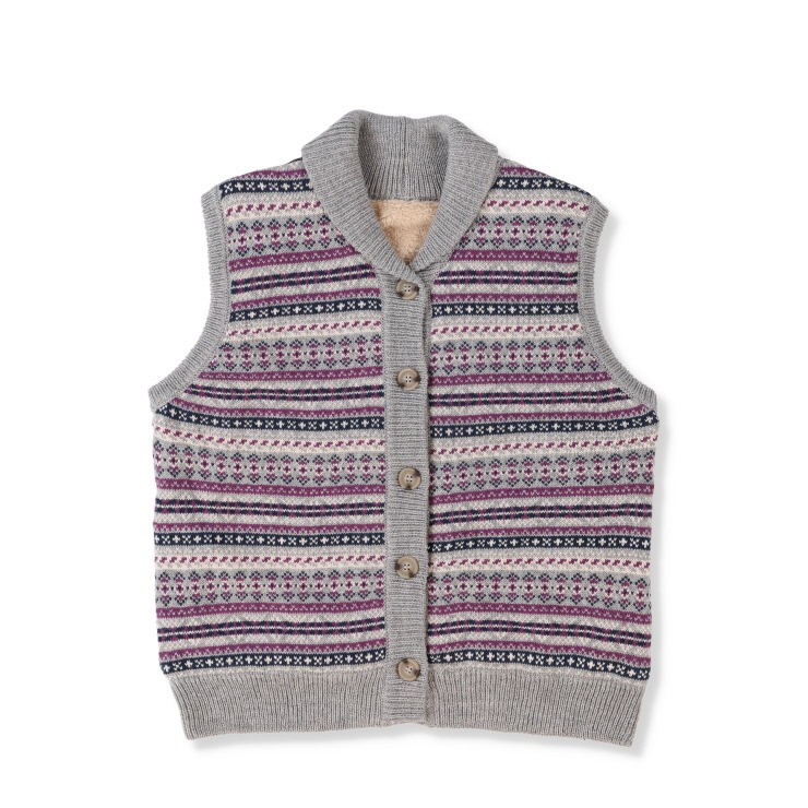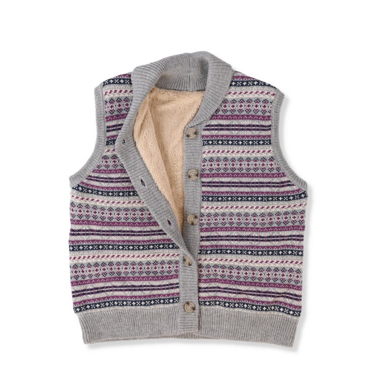 可愛らしい幾何柄と色使いがポイントのニットベストです。裏地にボア素材を使用しており、とてもあったかで、重ね着にもぴったりの優秀ニットです。ご家庭での洗濯機洗いも可能でお手入れ楽ちん!