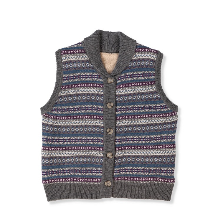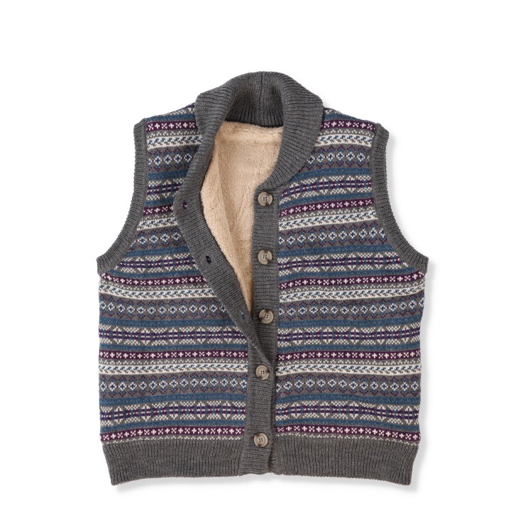 可愛らしい幾何柄と色使いがポイントのニットベストです。裏地にボア素材を使用しており、とてもあったかで、重ね着にもぴったりの優秀ニットです。ご家庭での洗濯機洗いも可能でお手入れ楽ちん!
