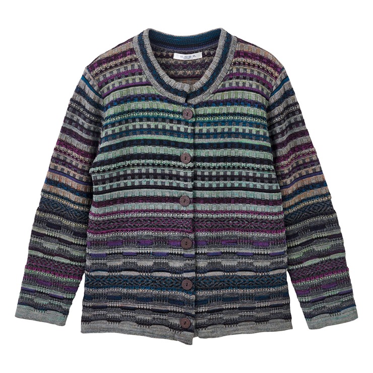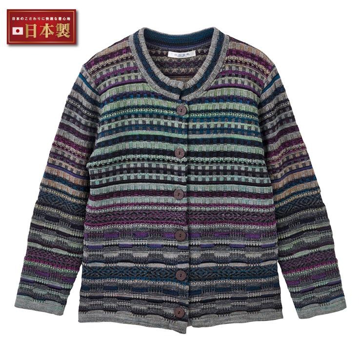 多色の色糸と絣糸を編み込んだ複雑な柄を、グレー系の落ち着いた色合いのカーディガンに仕上げました。