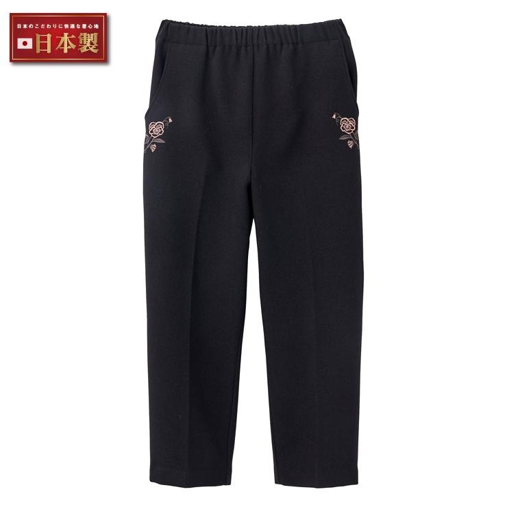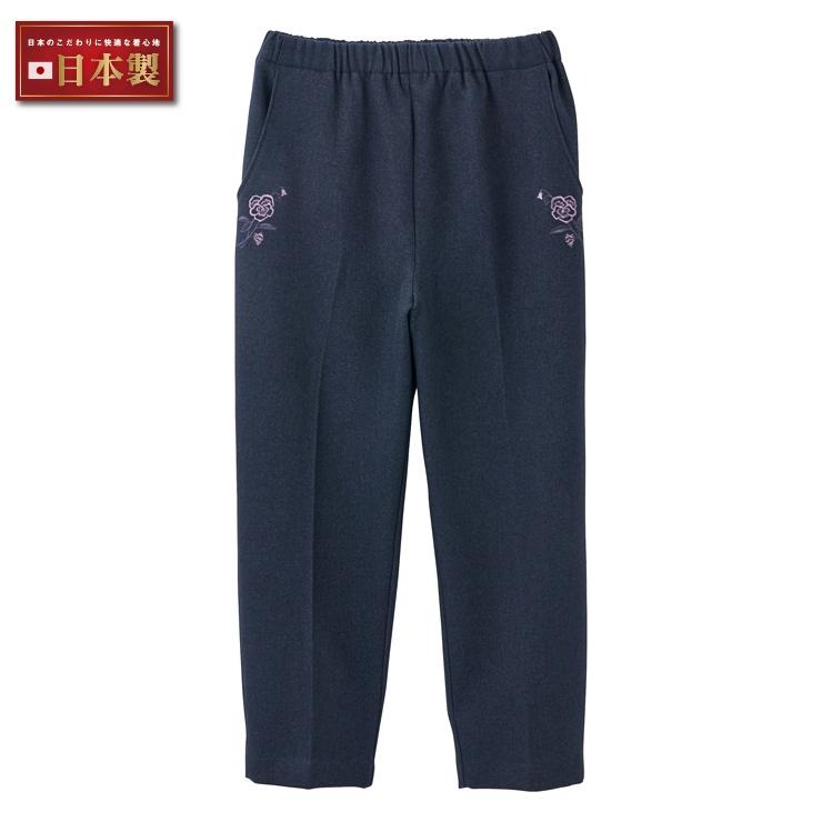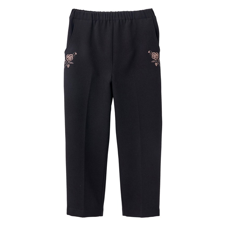 可愛いパンジーの刺繍をあしらった裏起毛パンツです。