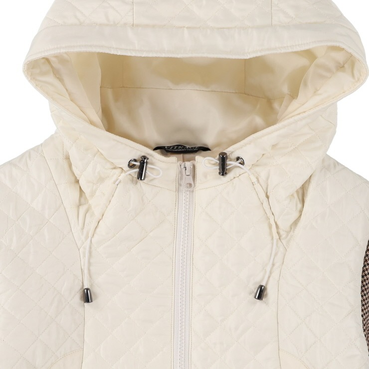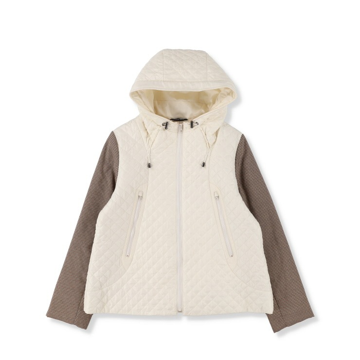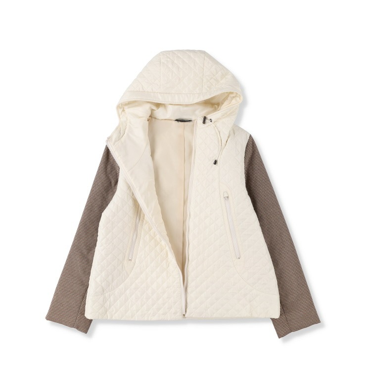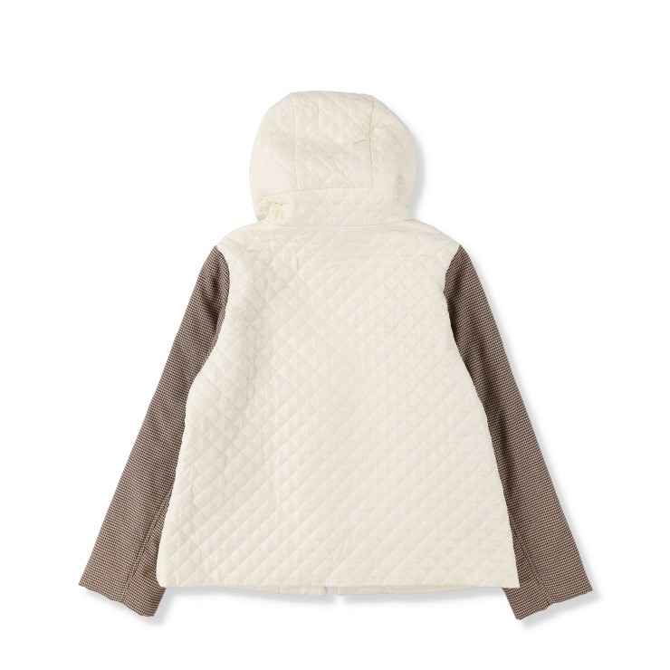本体にダイヤ柄をキルト加工し、袖は異素材の千鳥格子(中綿入り)で遊び心のあるジャケットに仕上げました。