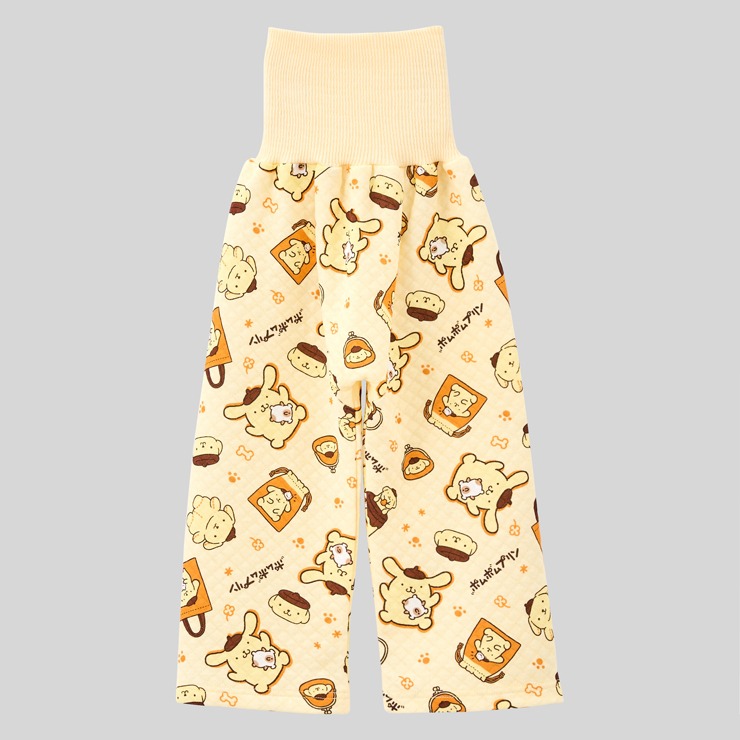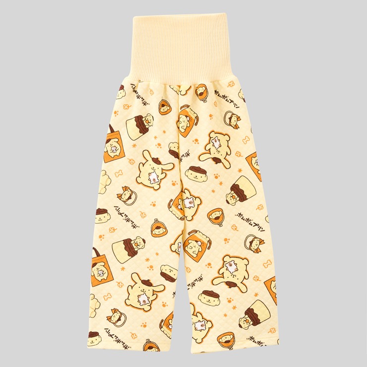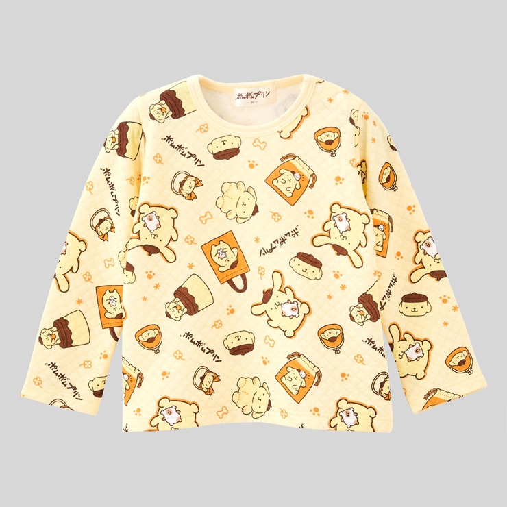 あったかキルト素材にポムポムプリン30周年限定デザイン総柄プリントの上着と腹巻付ロングパンツの組合せパジャマです。