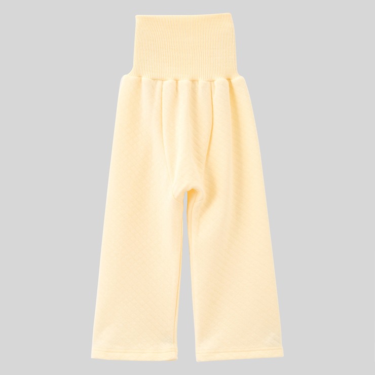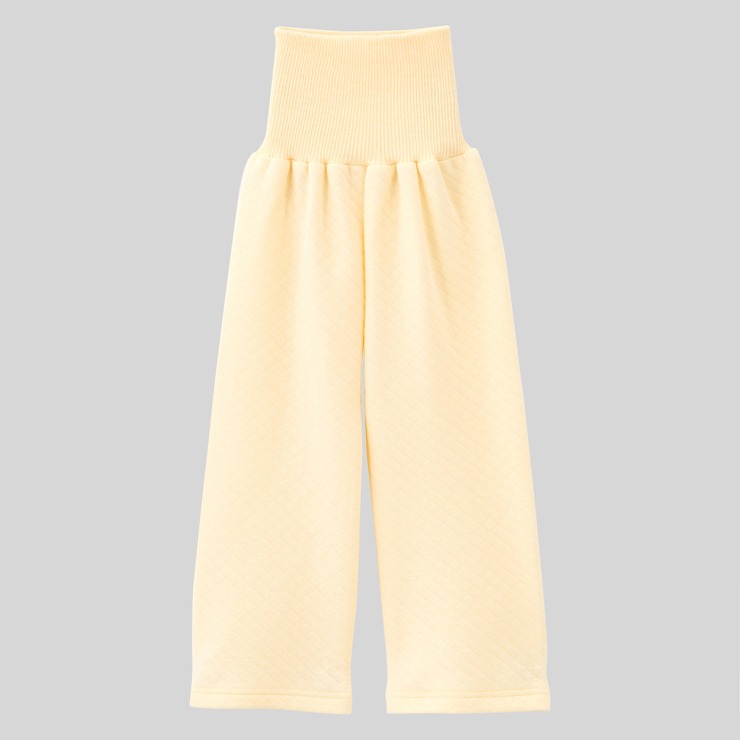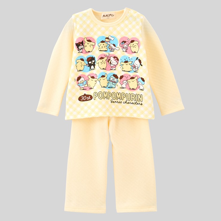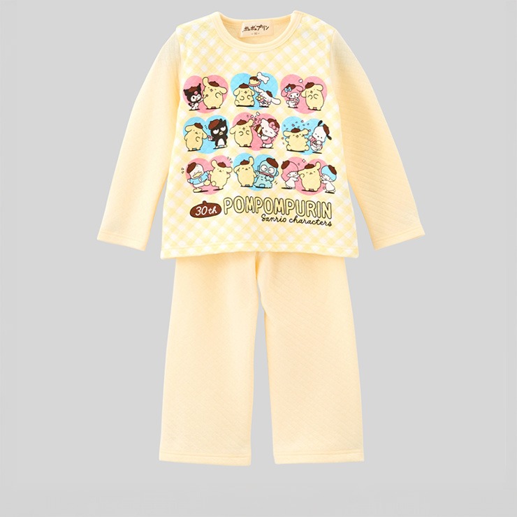 あったかキルト素材にポムポムプリン30周年限定デザインした上着と腹巻付ロングパンツの組合せパジャマです。