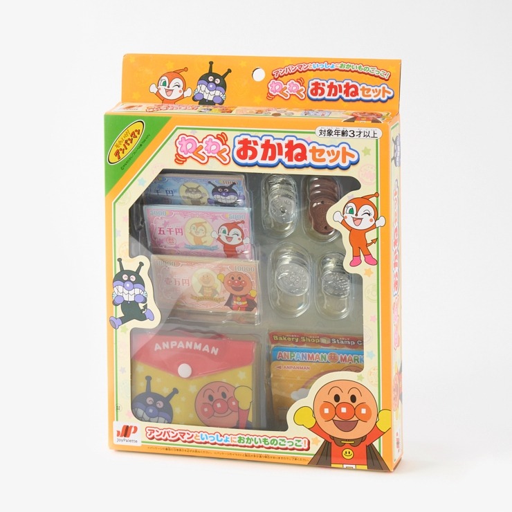 アンパンマンのおかねあそびごっこセットです。おもちゃの紙幣や硬貨だけでなく、カードも3種類にお財布もついています。これ1つでお買物ごっこ遊びが楽しめます。
