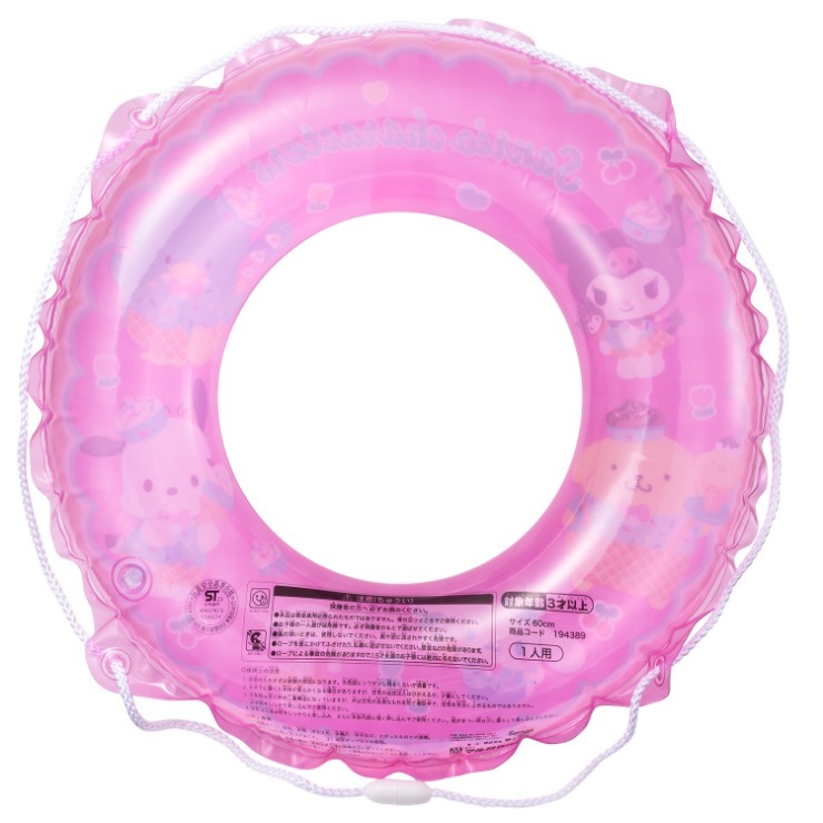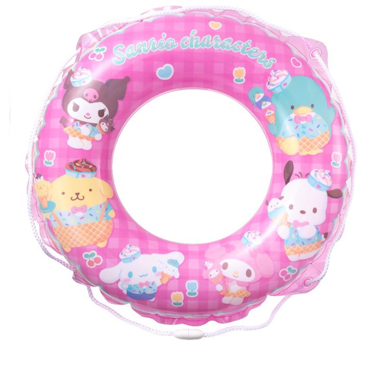 サンリオのかわいいキャラクターたちがプリントされた浮き輪です。マイメロディ・クロミ・シナモロールたちがデザインされています。空気を入れた時の内周サイズは85~90センチメートルです。