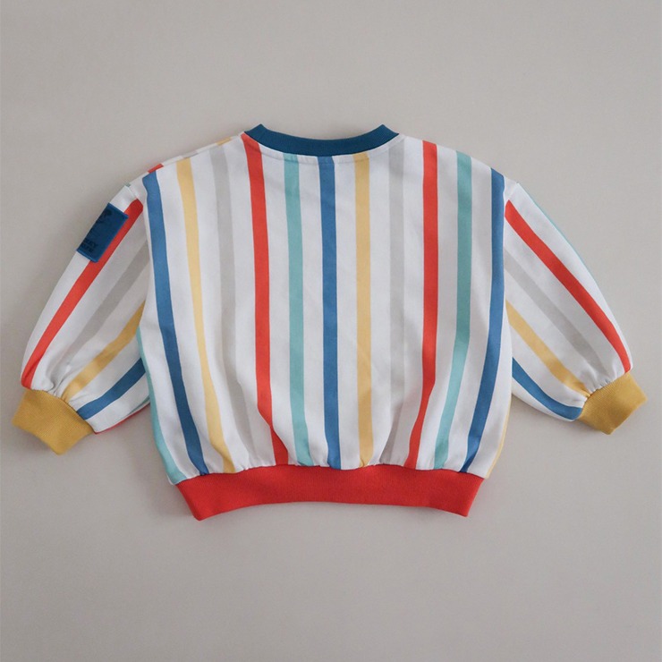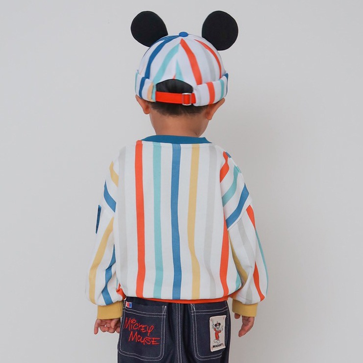 可愛らしいミッキーと、目を引くカラフルなストライプが特徴の裏毛トレーナー♪