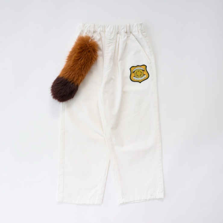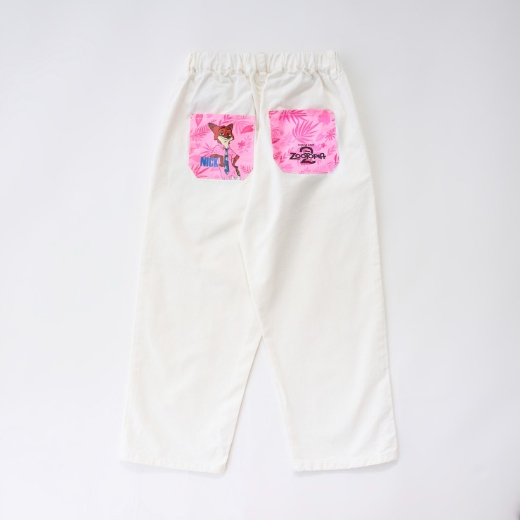 後ろのポケットにキャラクターがプリントされた、ツイル素材のロングパンツです。