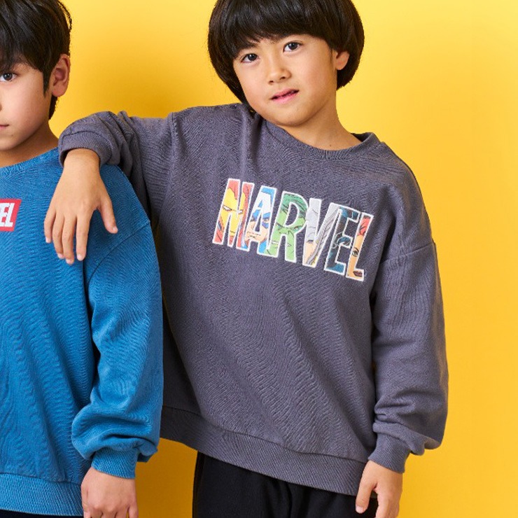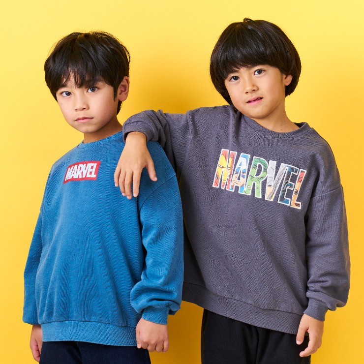 MARVELのロゴとキャラクターを組み合わせたプリントをのせた、裏毛素材のトレーナーです。