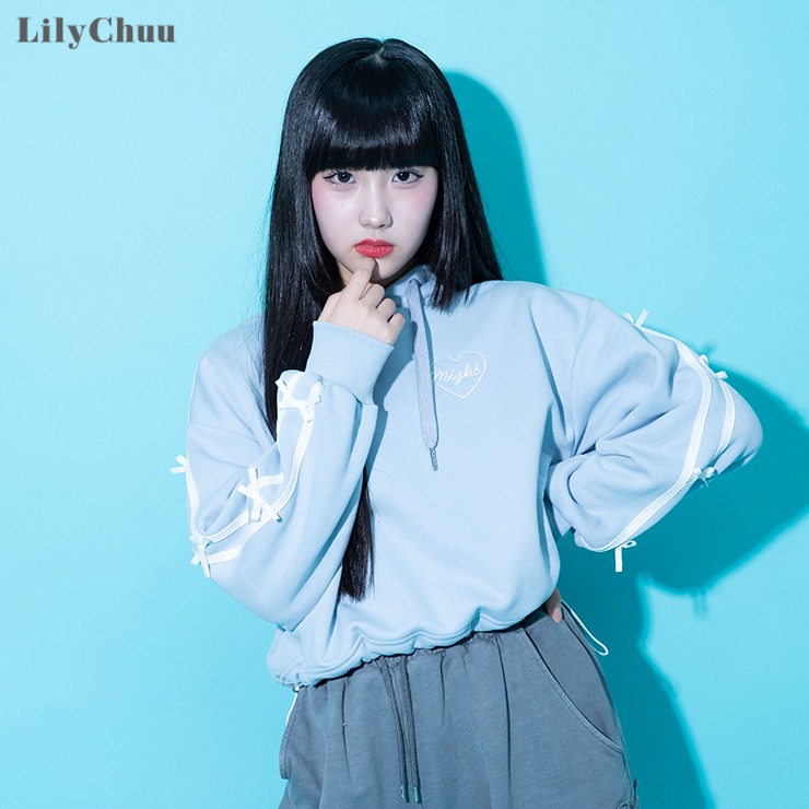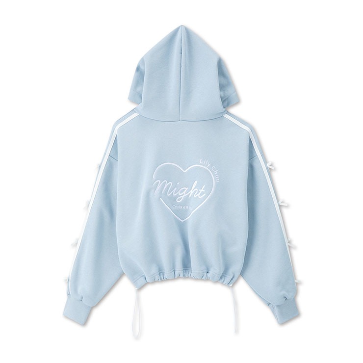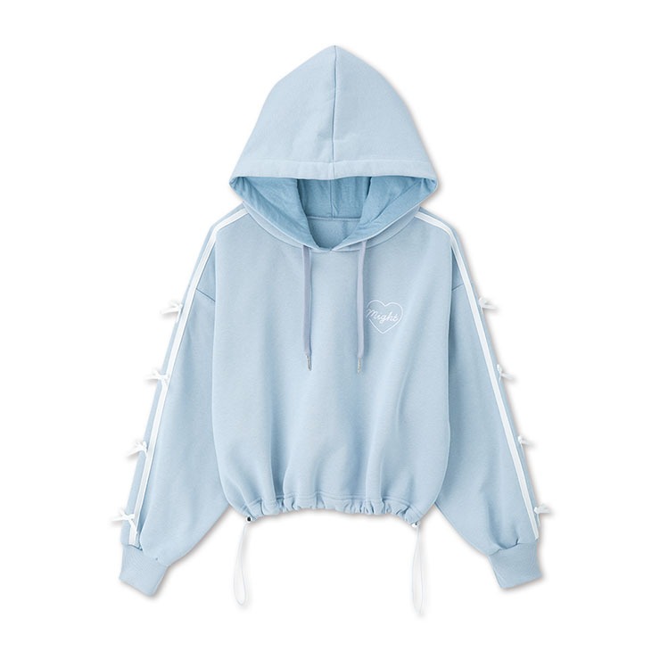 袖のリボン付きレースラインが目を引くプルパーカ。