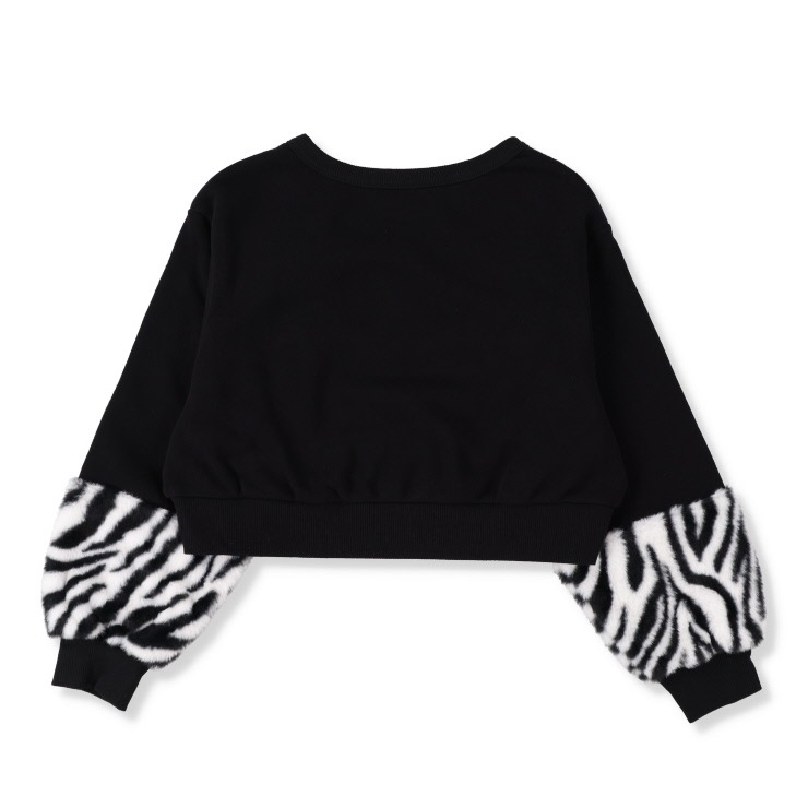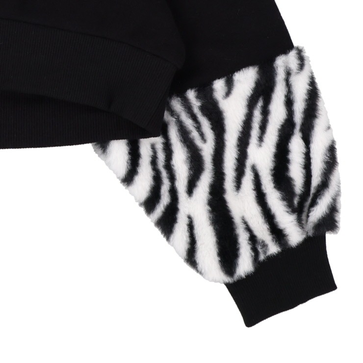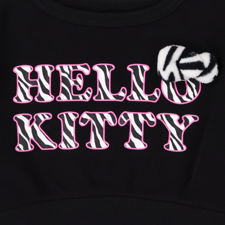 袖のゼブラ柄ファーの切替がおしゃれなプルオーバーです。共地のハローキティのリボンもかわいい!裏起毛素材であたたかいです。
