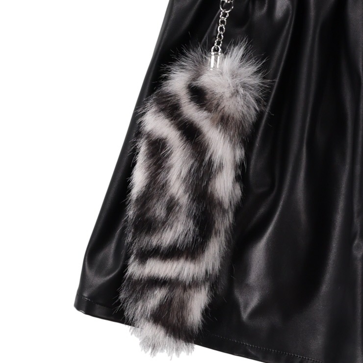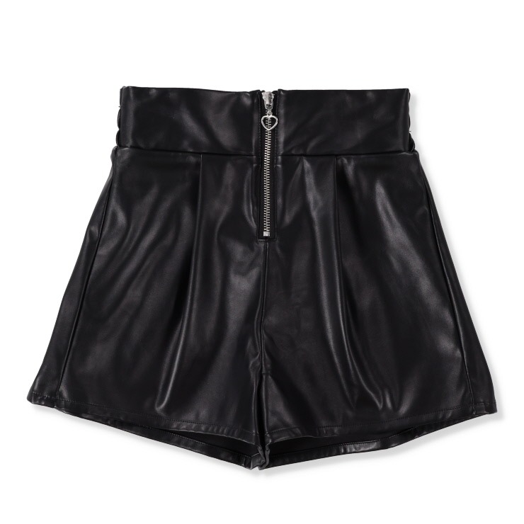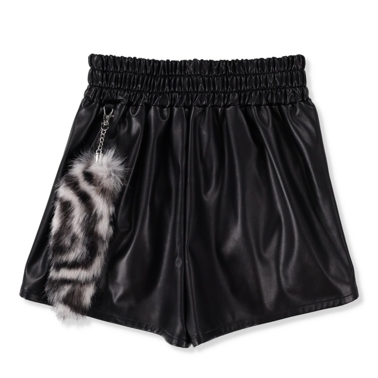 合皮素材のショートパンツです。センタージップの引手のハートチャームがかわいい!存在感たっぷりのしっぽ付きです。