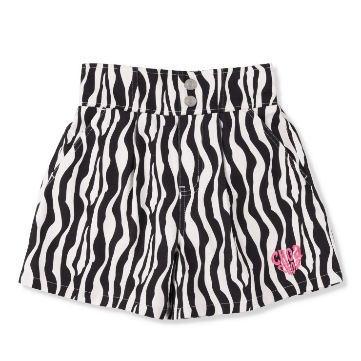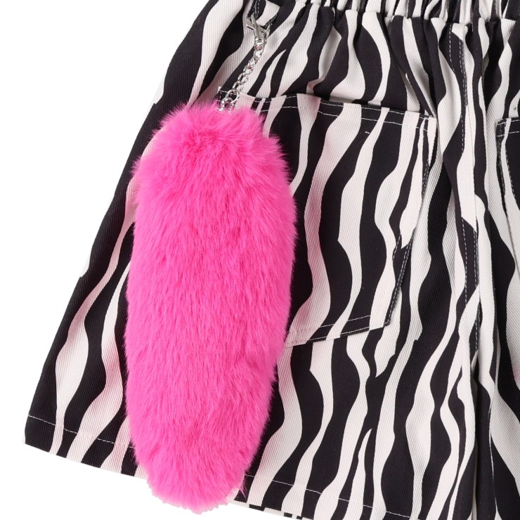 ゼブラ柄ピンクのハートロゴ刺しゅうとピンクのしっぽが映えるショートパンツです。
