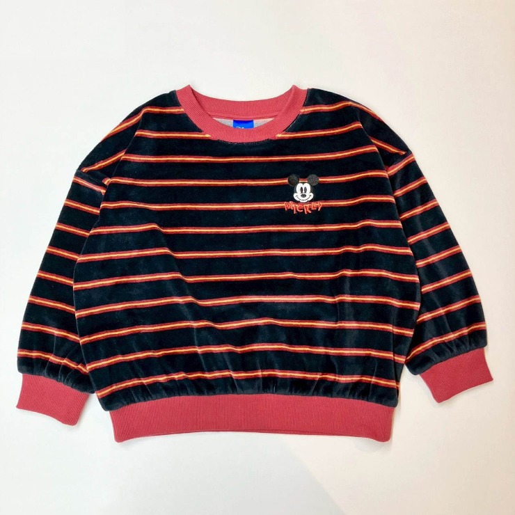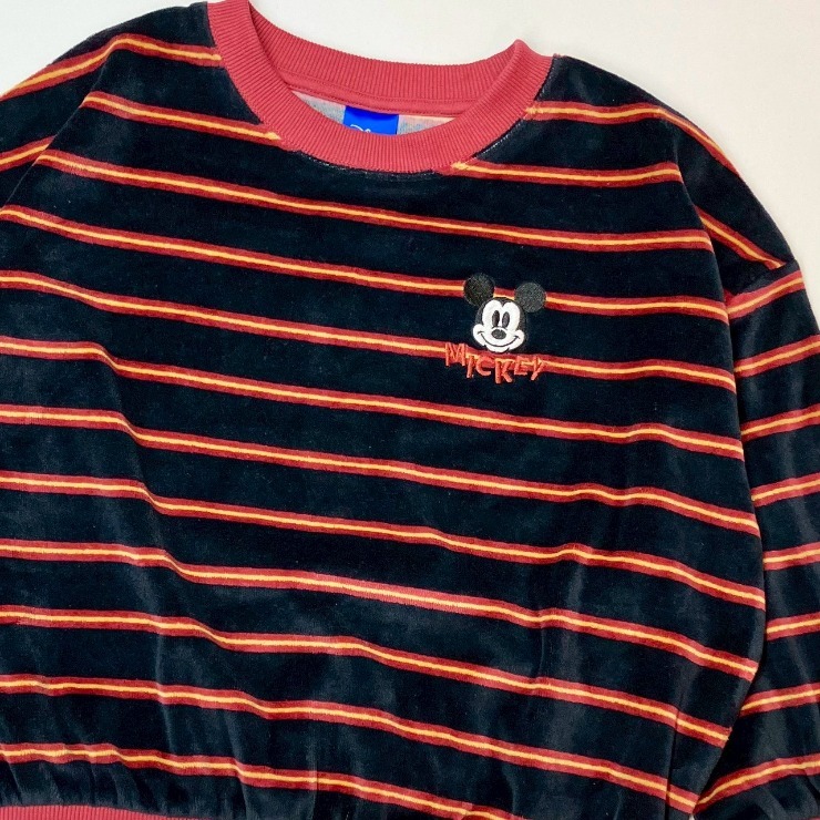 人気ディズニーキャラクターのワンポイント刺繍が可愛い、ボーダートレーナーをご紹介!柔らかく光沢があり、保温性に優れた綿ベロア素材を使用しています。